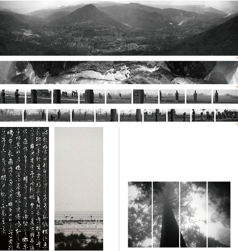 03.秋麦,《攀枝花》,2012,三桠皮纸本摄影打印,25.5 x 108 cm。图片由艺术家提供。04.秋麦,《虎跳峡》,2012,三桠皮纸本摄影打印,25.5 x 261 cm。图片由艺术家提供。05.秋麦,《北宋神道》,2005,安徽宣纸本摄影打印,26 x 416 cm。图片由艺术家提供。06.秋麦,《苏-Thoreau》,2025,三桠皮纸上摄影及双语书法打印,214 x 135 cm。图片由艺术家提供。07.秋麦,《影幔#8b》,2010,三桠皮纸本摄影打印,210 x 214 cm。图片由艺术家提供。