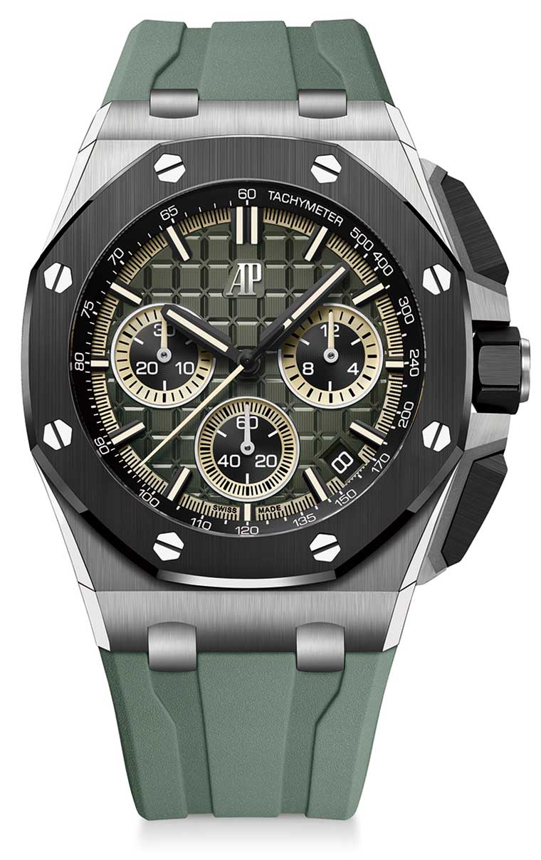 Royal Oak Offshore皇家橡树离岸型自动上链计时码表 极具运动风范的43毫米新作,以黑色陶瓷材质制成,营造出丰富的视觉对比,进一步探索全新创意疆界。腕表采用黑色陶瓷材质打造表圈、计时按钮及表冠,搭配钛金属表壳,彰显力量美学。“Mega Tapisserie”超大格纹表盘采用全新烟熏绿色PVD处理,缀以黑色与米色细节,使读时更加清晰明了。腕表搭配坚固耐用的自主替换式灰绿色橡胶表带,更添运动活力。搭载自2021年起应用于Royal Oak Offshore皇家橡树离岸型表款中的品牌自产一体式飞返计时机芯Calibre 4401。透过蓝宝石镜面表底,可欣赏到经镀黑处理的自动摆陀和精致的高级钟表润饰细节。与机芯一样,以陶瓷或钛金属材质制成的表壳部件被赋予与贵金属同样的精湛润饰处理。凭借鲜明的撞色设计和对尖端材质的大胆运用,新作延续了该系列对技术与设计创新的不懈追求。