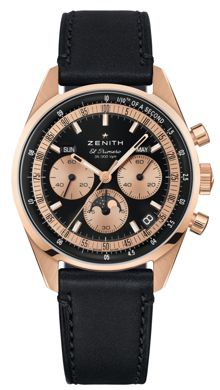 Chronomaster旗舰系列复兴款全历腕表玫瑰金版 腕表采用38毫米直径的精致表壳,恰到好处的比例设计则受到1969年时A386表款的开创性设计的启发,配备凸面箱形蓝宝石水晶玻璃表镜、锥形表耳与泵式按钮。表盘布局清晰直观、均衡有度且易于读取,将全历显示与El Primero腕表标志性的三计时盘结构融为一体。各项功能经由不同视窗巧妙呈现:星期与月份视窗对称分布于计时盘上方的11时与2时位置;日期显示沿袭El Primero腕表的经典传统设于4时30分位置,月相显示则优雅嵌入6时位置的分钟计时盘之中。玫瑰金与深邃黑形成优雅对比,这一设计语言延伸至指针与表盘细节,其计时盘、1/10秒刻度圈和时标均与表壳色调相得益彰。腕表刻面时标与指针均涂覆SuperLuminova SLN C1超级夜光物料,即使在昏暗环境中亦可清晰读时。搭载El Primero 3610型自动上链机芯,以5赫兹高振频运作,其计时秒针突破常规的60秒运转方式,指针每一次步进都精准对齐刻度圈上的1/10秒刻度指示。全历模块的加入未减损性能,仍保持60小时的动力储存。透过蓝宝石水晶玻璃底盖,一体式机芯内部结构清晰可见,蓝色导柱轮与饰有品牌标志性五芒星图案的镂空摆陀,诠释真力时对精密机械美学的追求。