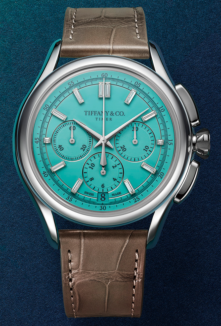 铂金腕表蒂芙尼 腕表采用40毫米抛光铂金表壳,线条流畅,曲面圆润;弧形计时按钮与表壳浑然一体,同时兼具表冠保护功能,共同勾勒出优雅不凡的整体造型。刻面表冠的设计灵感,源自闻名于世的The Tiffany Setting六爪镶嵌钻戒。抛光铂金的冷冽光泽,则与蒂芙尼蓝漆面表盘相映成辉。表盘之上,时标以狭长形切割钻石呈现,彰显蒂芙尼精湛的宝石镶嵌技艺与深厚宝石传承。为保持视觉色彩的和谐统一,时针、分针及子表盘指针均采用白金材质打造。表盘的制作历经繁复工序,耗时超过50小时,尽显高精度严谨工艺。首先,工匠使用微型工具,将一层蒂芙尼蓝哑光清漆均匀喷涂于表盘基底表面。为呈现理想的色彩层次,该工序需重复八次。随后,表盘被置入精确控温的窑炉中,经两小时烘干定色。此后进入多层涂覆阶段,工匠在表盘表面依次施涂15层透明漆,每完成一层,均须在严格控温控湿的环境中充分风干。待所有涂层完成后,表盘将再次入炉,历经超过12小时的烘烤。至此,仅第一阶段的表盘制作工序便已耗时达40小时。其后,工匠通过转印工艺,精准呈现表盘上的细节元素,再由宝石镶嵌师将狭长形切割钻石逐一镶嵌于时标位置。表背还镌刻有“限量60枚”字样。