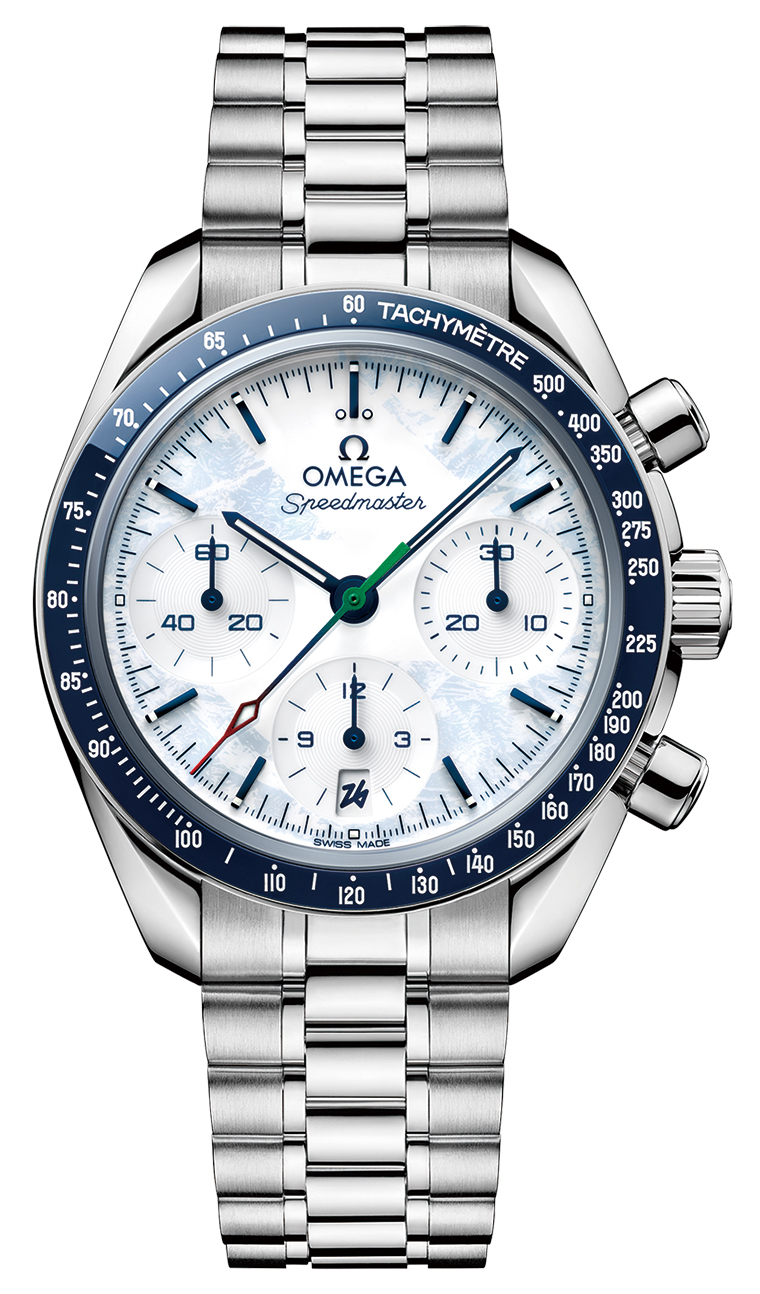 超霸系列“Milano Cortina 2026”腕表 计时表是欧米茄腕表的重要组成部分,它们是日常生活里跑步和赛车等运动中不可或缺的伙伴。新款设计将运动的韵律之美凝聚于方寸之间。表壳尺寸为38毫米,采用精钢材质打造而成,经抛光技术处理,搭配深蓝色陶瓷表圈,饰以白色珐琅测速刻度。白色漆面表盘之上覆有浅蓝色的冰霜图案,并呈现出手指划过冰面的轨迹,形成2026年冬残奥会会徽“26”的造型。同时,漆面小表盘采用特殊的Azurage同心圆雕纹工艺,如同精心修整的滑雪坡道,6点位日历窗的数字“26”采用深蓝色“Milano Cortina 2026”会徽图案,细节之处彰显不凡。此款整体设计与超霸系列“Milano Cortina 2026”冬奥会表款一脉相承,独特的细节包括表背饰有2026年冬残奥会徽章,中央计时秒针采用红、蓝、绿渐变效果,与冬残奥会会徽的颜色巧妙呼应。腕表搭配精钢表链,表链经抛光与拉丝工艺处理,表扣设有欧米茄研发的可调节功能,更方便佩戴。内部搭载欧米茄3330自动上链同轴机芯,动力储存达52小时,具备卓越的精准度。