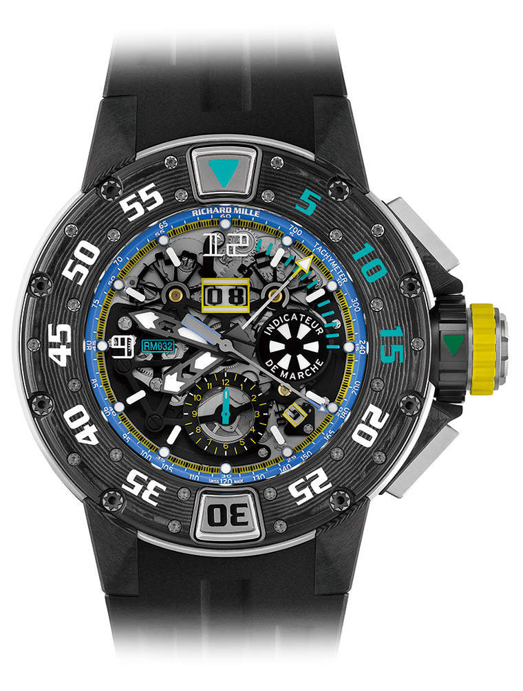 RM 032自动上链飞返计时码表终极版 设计的核心功能是其安全性和易读性,专为潜水人士精心打造,并确保腕表的耐用性。腕表配备时、分、秒显示及12小时累计计时和飞返计时功能,12点位置设有超大日期窗,4点和5点之间设有月份显示。日期显示的数字由两个DLC钛合金圆盘组成,数字以“反向模板”的轮廓剪影形式镂空展现。3点位置设有运转指示器,压力环境下可查看机芯运转是否正常。运转指示器上的Super-LumiNova夜光运转指示盘以每分钟2转的速度旋转,巧妙地与黑色扇形交替显示,确保在各种光线条件下都能提供卓越的可视性。RMAC2机芯采用PVD涂层五级钛合金底板和桥板,由无卡度游丝摆轮驱动。标志性的可变几何结构摆陀将动能储存在两个发条盒中,可提供50小时动力储存。机芯由50毫米x 17.8毫米尺寸的表壳保护,展现出其坚固耐用的特性,防水深度达300米,表壳顶部配有单向旋转表圈。表壳结构采用五级钛合金和Carbon TPT碳纤维嵌件等重量轻而坚固耐用的材质。固定式表圈为缎面打磨五级钛合金材质,倒角经抛光处理。旋转表圈由微喷砂DLC五级钛合金打造,与Carbon TPT碳纤维材质半表圈搭配,并以八点星形螺丝固定。水压可能会对表壳和表冠施加压力,意外激活按钮。锁定表冠设计可以固定腕表功能,同时具有优异的防水性能。表冠和按钮只需旋转圆环即可锁定。得益于最大压力密封,防水性能进一步提高。