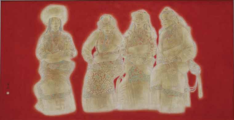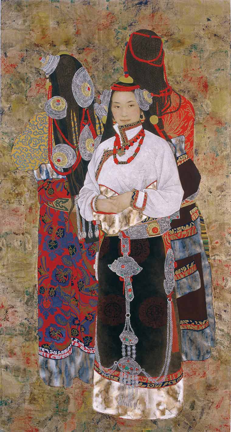 郑美秋现为中国美术家协会会员,首都师范大学艺术硕士,国家一级美术师,中国艺术研究院特聘研究员,中国重彩画高级研修班导师,中国女画家协会理事,北京城市山水画研究会理事。作品多次在国际国内展览中获奖,2009年《扎西德勒》《寻找香巴拉》《神系滇疆》三幅作品同时入选第十一届全国美展中国画、综合材料、壁画展览而引起广泛关注。2016年《扎西德勒》被中国美术馆收藏。出版专著《佳丽传神——中国工笔画解析郑美秋卷》《郑美秋重彩作品精选》《盛世典藏郑美秋作品集》等。艺术要求异,而非趋同 郑美秋在创作中,始终用视觉语言来表现自我感受,描绘理性概括的综合印象。例如,在作品《澄明世界》中,她用绘画语言塑造了一个澄澈透明的、神圣的女性世界,画中四位身着盛装的端坐着的藏族女性,形象典雅端庄、神态美妙超然而又祥和。蒋采苹先生曾评价这种表现方法很有学术性、有个性有创造力,前人没有做过。 “在人物形象上,我尽量回避世俗化的情节性的东西,不去描绘人们正在牧羊挤奶、喝茶聊天或是洗衣做饭,而是选择有代表性的人物形象或坐或站的舒适的常态。这是为了和照相机的瞬间取景相区别,表现一个艺术家的眼光下,对这一地区自然与人文的综合印象。构图上,我会选择将人物形象放在画面中央,增加宗教感和庄严感。有时候会不厌其烦地描绘繁琐的盛装服饰或者做一个非常复杂的背景,甚至我会直接借用唐卡中的宗教形象,来表现藏地的文化样式和厚重感、仪式感。” 《扎西德勒》是郑美秋的代表作品之一。在这幅作品中,郑美秋主要展现了三位身着盛装的藏族女性。作品构图上凸显了藏族女性的庄严感和崇高感。其中一个人面向观众,面带微笑,从容自信;两个背向观众,将服饰最华丽的背部展示出来,成为一道风景。 “为了既能突出主体,又能展示背向观众的盛装女子服饰鲜艳华丽,在画面的色彩关系以及余白部分的色彩处理上,我的确费了一番心思。此外,为了在形象塑造上追求平面化,人物的金银饰物是用金银箔贴出来的,面部和手是用水色仔细勾线渲染,人物服饰中的毛皮质感,采用几种颜色撞水的画法画的,是画面上较轻松活跃的部分,其他服饰部分完全是勾线平涂。” 矿物颜料和金箔银箔在郑美秋的西藏题材作品中发挥了重要作用,在她的作品《冥冥》《扎西德勒》《寻找香巴拉》《盛世和光》《山那边》《冈仁波齐》和《盛装》等系列作品中都可以看到。实际上,使用矿物颜料画画是中国画的传统技法,天然矿物颜料可以千年不变色,古代壁画比如敦煌壁画和唐卡中就是如此。“矿物颜料的材质美是其他颜料所不能比的,它是矿物晶体粉末。比如珊瑚粉、水晶末、朱砂、云母、蛤粉、雄黄、雌黄、石绿(孔雀石)和石青(青金石、蓝铜矿)等。还有许多人工高温烧制的代矿物颜料,这些矿物颜料色彩沉稳又饱和,闪着宝石特有的光泽,增添了一种珠光宝气的华美,和金箔银箔一起,更是产生错彩镂金的视觉效果。矿物颜料经过严格分筛,产生了不同的粗细颗粒和色彩渐变,粗的矿物颜料可以画得很厚,可以‘沥粉堆金’,细的矿物颜料可以薄薄地反复多次地渲染。” 郑美秋绘画时并非一气呵成,而是经过方方面面的不断琢磨调整,以期达到心中的画面。2016年,郑美秋在青海玉树看了赛马节,“那是辽阔的草原上成千上万人的集体狂欢,节日内容丰富,持续好多天。我当时搜集了大量的信息和资料,有藏戏歌舞,体育比赛,有宗教仪式,有开幕式上放飞的鸽子、气球、烟火,还有让人眼花缭乱的盛装美人。在众多的形象中,我选择了即将上场比赛的六个康巴汉子和六匹马来表现。”但是绘制过程用了半年多的时间,《赛马节》这张画到2019年上半年才画完。“我在创作中从典型形象、构图安排、色彩搭配、绘画材料、绘画技法的选择上都是为了表达和表现我对藏区的情感服务的。” 艺术家在艺术中的探索,其实是一次次寻找自己的过程。郑美秋的艺术探索是一条独特的创作之路,她在传统工笔重彩画技法和材料的现代性两方面不断前行,正如郑美秋所说:“艺术的本质在于求异,而非趋同。”对话郑美秋: 赞颂真善美 Q:当前,您在创作的时候希望作品最终能够呈现出怎样的情感? A:我希望我的作品能表达人们内在的、普遍的、高层次的精神诉求,赞扬人性中美的、真诚的、善良的一面,能经得起长时间的注视和推敲。这是一个目标,我永远都走在路上。 Q:的确,艺术品需要经历时间的考验。那么,优秀的作品有怎样的共性呢? A:不管时空如何变幻,人类的共性与共情是永远不会改变的。在人类几千年的艺术史上,那些以爱为基础和出发点,展现人类最美好的精神境界和艺术水平的优秀视觉艺术作品,就是可以流传下来,穿越时空被我们现代人解读欣赏。 Q:对于年轻的艺术家,您有什么样的建议? A:创作一幅好画,和创作一篇好文章的过程与要求大体上一致。一篇好的文章不是华丽辞藻的堆砌,而是言之有物,在于作者用精准的文字表达了高超的思想。一幅好画也不是在画面上炫耀材料技法,而是通过视觉语言表达和表现了什么情感什么思想,从而引起了观众的共鸣。 Q:如何才能做到引起观众共鸣呢? A:这不是一件容易的事情,每个人看问题的角度不同、自身的经历不同,对同一问题往往可以得出不同的解读,甚至是完全相反。