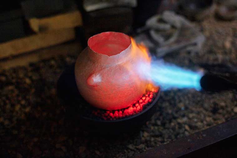 Q:您常以宋代建盏为载体,却融入秦汉金文、石刻元素。这种跨越时代的审美融合,是基于怎样的思考?您如何理解“古”与“新”在器物上的关系? A:建盏是我创作最重要的载体,而福建建阳是它的发源地,在福州也容易找到它们。但从个人角度,我更偏好秦汉的恢宏古朴,所以在很多宋代建盏上,我表达的内容和方式是以秦汉美学为主。 一件残破的建盏,被挖出来的时候釉面已经被侵蚀大半,按寻常的方式难以修复。我另辟蹊径,把残存的釉料刮掉,让坯体暴露出来形成新的平面,然后在上面錾刻金文。以古器为依托,以文字为阶梯,去追索传统文化脉络,这是我一直的创作主题。 “古”与“新”在器物上不是对立的关系。宋代的盏,是在宋代具体化的产物,但它不是从天上掉下来的,一定有几千年的发展路径。我在建盏上做的,就是以它为载体,去表达中国传统文化的发展路径。 我曾专门去咸阳的霍去病墓考察。霍去病的墓以祁连山为造型,石雕依石而就,寥寥几道,崇尚的是天地人的自然关系。那种雄浑、与天地融为一体的气势,给我极大震撼。福建多山,相对封闭,当中原士族为避战南迁至此,文化的基因一直留在血液里。我认为建盏的气质,就带有这种秦汉美学的延续。中国人造物是有讲究的,背后一定有支撑。我想在器物上留下文化的“痕迹”。我2021年的展览就叫“迹象”,所有人类活动都会留下痕迹,考古学就是在寻找这些东西。所以,从河图系列到小篆、大篆、隶书,路径一致,只是表现形式不同。这种不同,就是我与盏对话的结果。 Q:修复后的器物往往兼具实用性与艺术性。您如何平衡二者的比重?是否认为当代手工艺品应更强调某一方面? A:在形式上,我还是遵从器物本身。是它在告诉我,而不是我去设定“必须用黄金或贵金属”。这里有随性,也有交流的结果。 另外,我对一个残破器物的“价格”和“价值”的理解是有区别的。价格是市场流通的标价,而价值可以很大。比如一个宋代建盏,存世量少,但它可能没烧熟,形态歪斜,市场价格不高。可我若与它产生了共鸣,感受到它传递的某种触动,我就会跟随它走。具体用什么材料,是顺遂它的意愿。我觉得它想用银,我就用银;用什么技法去化解缺陷,都是跟随它。没有那么多的价格观念。 我做东西有一点:我不讨好别人,我讨好的是自己,是当下我对这件东西的理解。有的器物放了很多年,起初没想法,但我还是收着。突然有一天,我想做了,做的时候也没有预设,就是进去了,跟着感觉走,觉得就该用这种表现形式。 我觉得这样很幸福,不需要重复自己。每一件器物,每一次修复,都是一个独立的、如初见般的体验。这也是很多手艺人容易出的问题——太熟了,熟了就生“匠气”。好作品,一定能让人感受到某种力量,包括作者的状态。我甚至能感受到古代陶工做这个盏时的状态和手上的动作,打动我的恰恰是这种有缺陷但生动、活泼的“人味”。