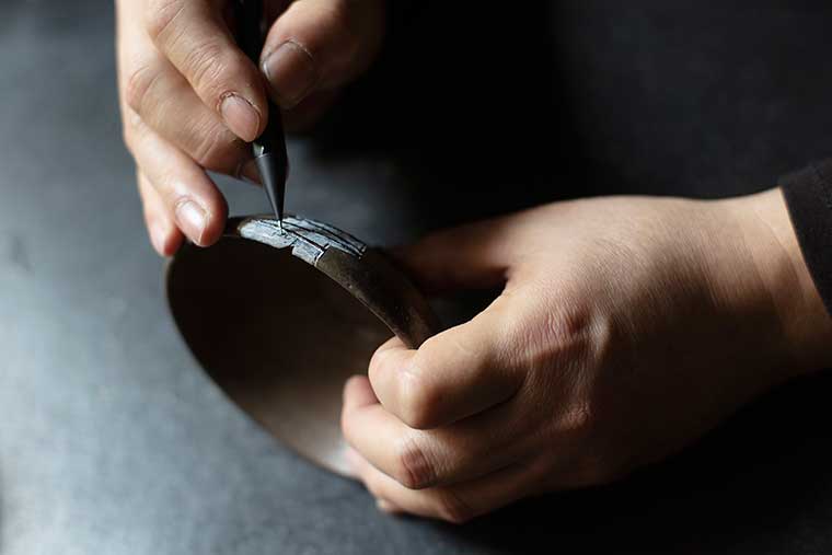 Q:您的创作涉及锔瓷、金工、雕刻、漆艺等多重技艺。您如何理解不同工艺在“修造”中的角色?是否有意识地去打破某些传统工艺的边界?过程中遇到的最大挑战是什么? A:我对中国传统文化的溯源性怀有极大兴趣。研究锔瓷时,我想知道它到底属于哪个领域。后来通过大量拜访学者,到中国美院、清华美院、南京艺术学院、广州博物馆等地请教,我得出的结论是:锔瓷本身就源于金工系统。所以我会去做锻造、做金工,是为了解决它的“根”的问题——弄清楚“它是谁”。当知道了它从哪里来,我才可以拓展。如果不知道根本,就会失去方向。 所以,从锔瓷到金工,再到修造概念的形成,是一个发展的过程。当我知道它的根本所在,各种技艺才能相辅相成。 2018年我从广西移居福州,这是一个重要的转折。在福州,我接触到了寿山石雕刻、漆器制作、根雕,不是说具体地去学一门技艺,而是从这些工艺里面去总结共通的地方,然后融合到自己的创作中。每门工艺是一个载体,工艺之间是相通的。 与此同时,来福州后,我产生了一个新疑问:如果传统锔瓷工艺也无法修复器物,那该怎么办?残缺的器物是不是可以呈现另外一种美?就这样,沿着问题走下去,我把在福州学习的雕刻、漆艺等融入创作中,从起初简单的外部雕刻,一层层往里走,拓展传统器物再生之路,使得残破的古老器物既得以保留本来气息,又以焕然一新的面貌重生于当下。 最大的挑战不是技术本身,而是如何让多种工艺和谐共生,不喧宾夺主。器物永远是主角,修造只是配角。我要听从它想成为什么,而不是我去设定它必须成为什么。 Q:您曾赴清华美院、北大考古文博学院进修,并师从日本教授学习象嵌技法。这些系统性的学术训练如何影响您的创作视角?对于“手艺学习是否必需学院化”这一问题,您怎么看? A:从一个企业家转入传统手工艺,对这个领域而言,我可能像个“小白”。虽然之前接触过陶瓷,但我要探究的东西很多,需要通过不断学习来解决。 2017年我到清华大学美术学院进修,师从日本东京艺术大学前田宏智教授学习日本传统象嵌技法。2023年至2024年在北京大学考古文博学院研修宋代艺术考古美学。这些学术训练让我更深刻地理解了器物背后的历史文化脉络。比如建盏,在宋代的美学体系里,它其实是一个非常另类的东西,不懂的人看它就是黑乎乎的一团。与其他宋代瓷器的文秀雅致不同,建盏的这种率真和厚重,其实沿袭的是秦汉美学。 至于“手艺学习是否必需学院化”,我认为学习是必需的,但形式可以多样。学院教育提供的是系统性的知识框架和溯源能力,这是非常宝贵的。但手艺的本质是实践,是日复一日的打磨。两者不是替代关系,而是相辅相成。天赋给了你感知能力,但你需要有对象去感受,需要一把钥匙把内在的东西打开。这把钥匙,可以从书本中获得,从视频中获得,但更要从现场、从实物中获得。