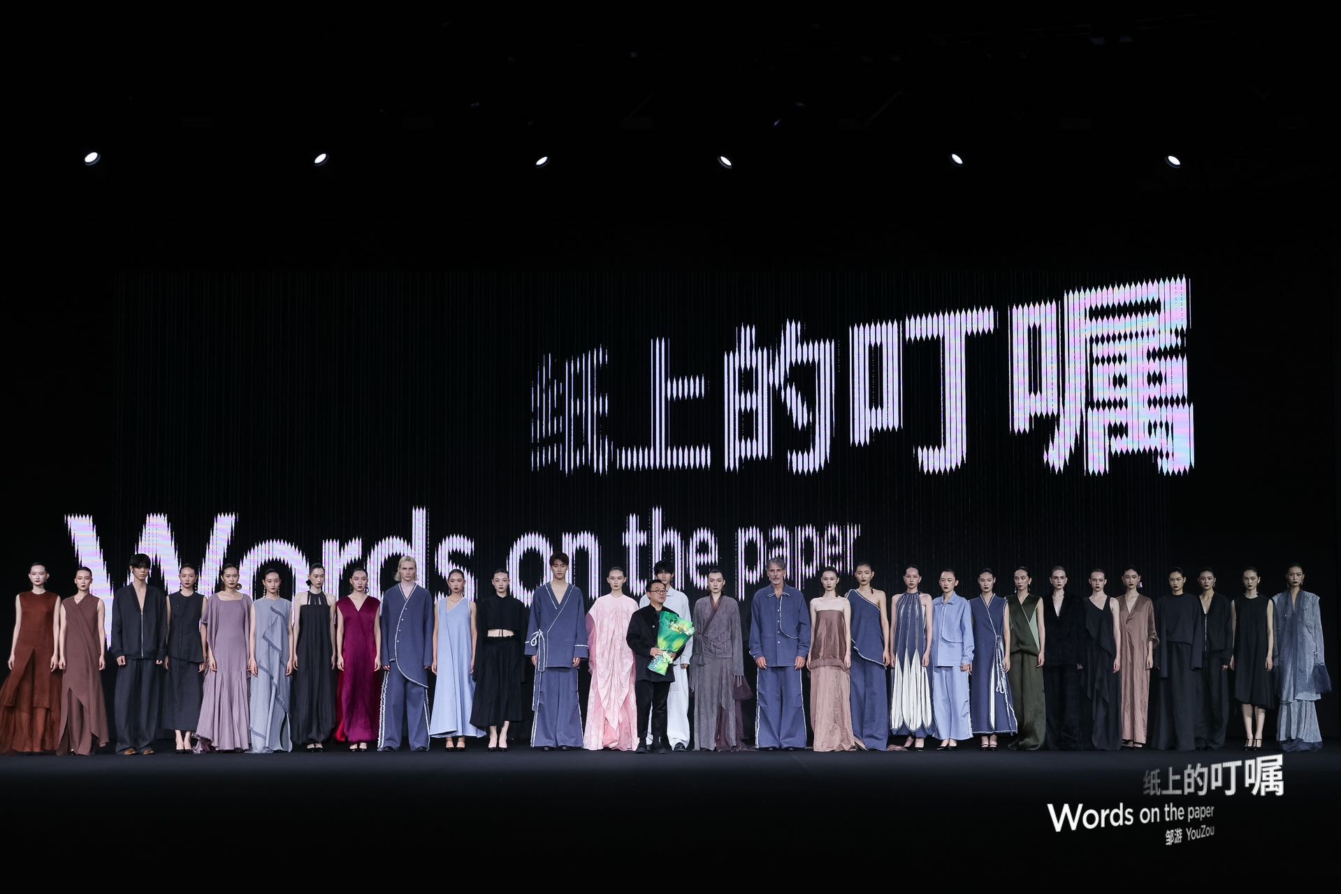 《纸上的叮嘱》主题源自对过往文字与图像的重新审视与诠释。邹游教授以纸张为媒介,将历史的痕迹以拓片的形式重新投映,通过服装的结构与材料,展开一段段历史的剖面。每一件作品都仿佛是一封穿越时空的信件,承载着过往的叮嘱,与当代人进行着一场跨越时代的对话。观众在欣赏这些作品时,不仅能够感受到时尚的魅力,更能体会到历史的厚重与温度。