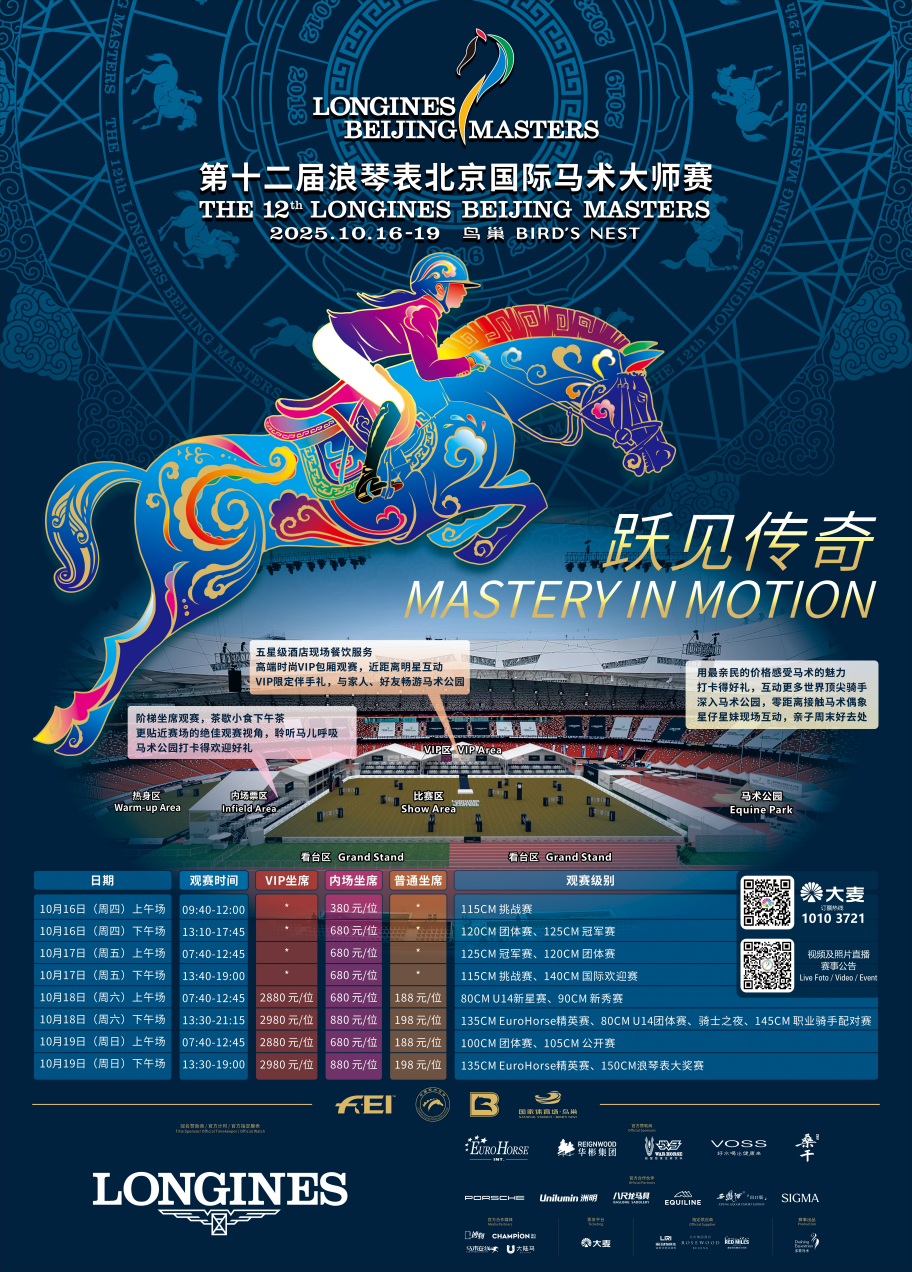 第十二届浪琴表北京国际马术大师赛于9月26日 10时18分,敬请通过大麦平台获取官方购票信息,即刻锁定心仪席位,相约10月16日至19日的国家体育场(鸟巢)。在这场融合技艺、优雅与激情的马术盛典之中,跃见传奇,续写华章!