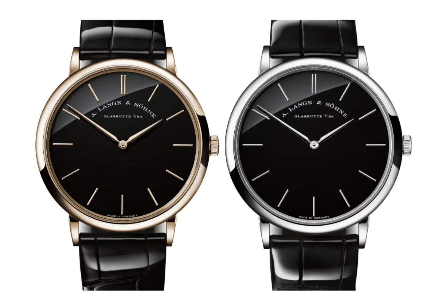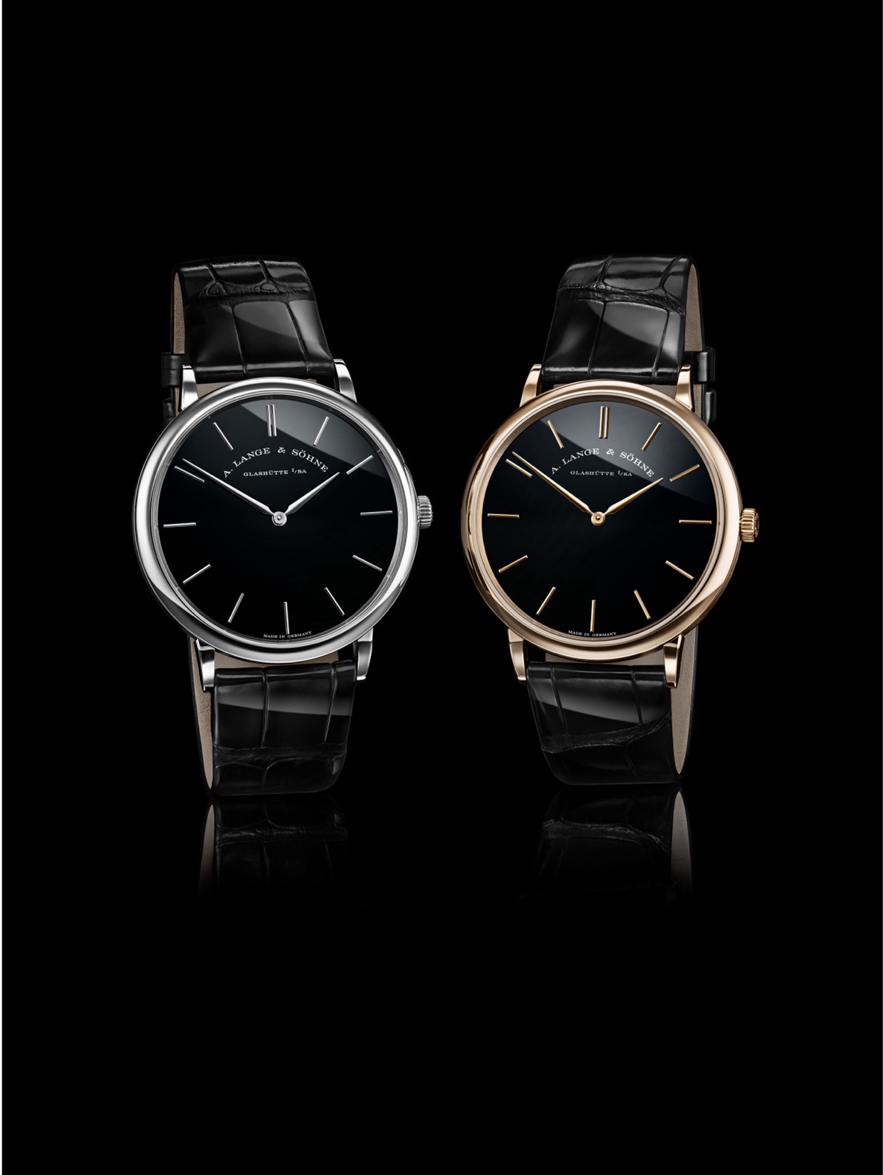 新款 SAXONIA 萨克森纤薄腕表 750 蜂蜜金®款(左)和铂金 950 款(右)