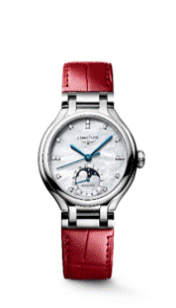 浪琴表隆重呈献全新设计的心月系列星辰腕表,这一重塑之作诠释了品牌理念——真正的优雅是在演进中坚守永恒真谛。该表款采用重新设计的34毫米精钢表壳,白色珍珠母贝表盘镶嵌14枚钻石时标。心月系列星辰腕表,首次将月相与日期显示相结合,搭载专属 L899.5 自动上链机械机芯,配备防磁硅游丝。表冠设计极具诗意——如气泡般圆润的造型令人联想到满月,而环绕表面的新月纹饰,则与内置的月相复杂功能遥相呼应。搭配典雅红色鳄鱼皮表带,或全新设计的精钢表链(半月短链节)。