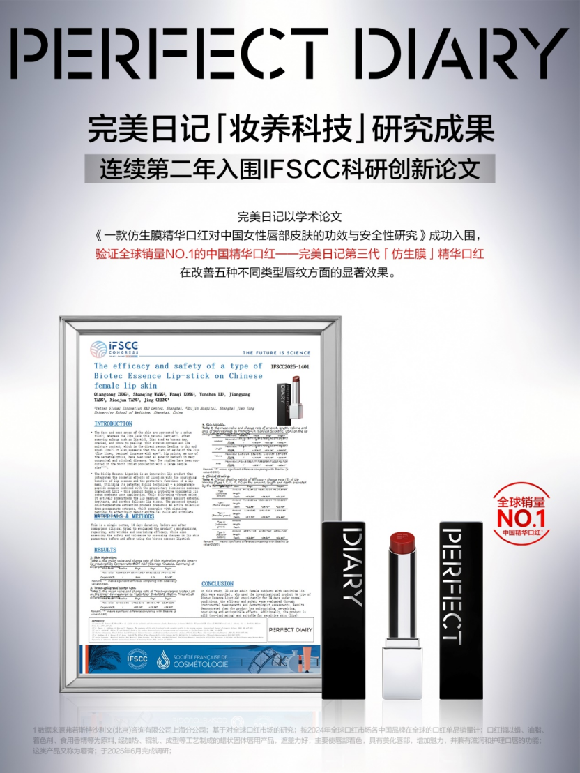 与首创 「妆养仿生膜™」明星套装亮相这一全球化妆品最高学术舞台。品牌科研成果连续第二年入围IFSCC科研创新论文,并展示了全球销量NO.1的中国精华口红——第三代「仿生膜」精华口红在改善五种不同类型唇纹上的显著效果;IFSCC主席Vania Leite亲临完美日记展位,与团队探讨如何集结全球科研力量共研仿生膜科技。