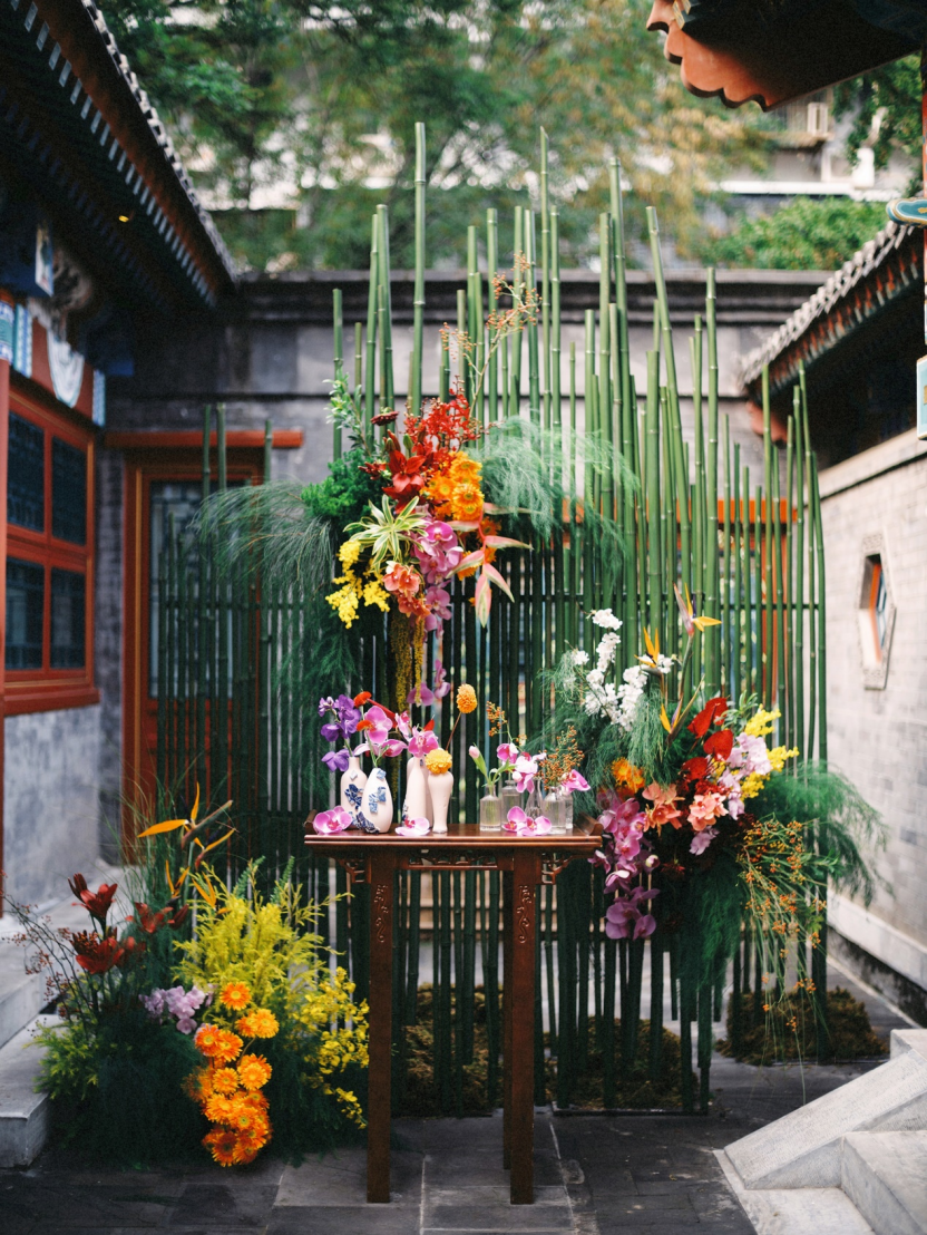 一进院签到区以 “竹墨迎宾” 为核心,竹子花艺幕墙格外吸睛。步入二进院,院落中央化身仪式区,主背景墙如梦似幻好似凤凰于飞,新人在此交换戒指,仿佛置身流动的诗画仙境中。相邻的客厅则作为敬茶区,红木八仙桌搭配喜庆瓷质茶具,传统敬茶仪式在此尽显庄重雅致。三进院作为用餐区,延续 “墨韵食趣” 理念,餐桌中央竹编鲜花苔藓点缀其上,将中式浪漫延续至这最终的庆祝时刻。