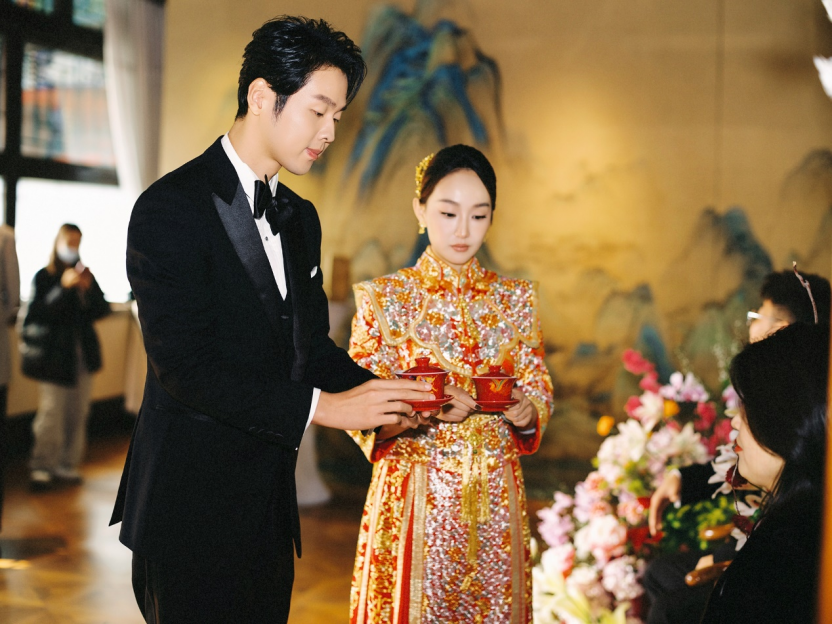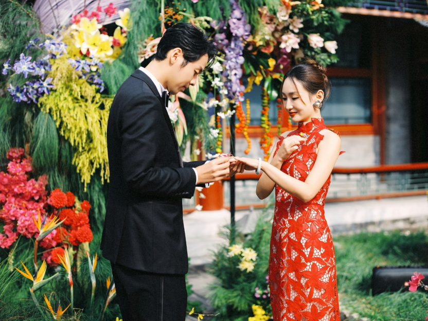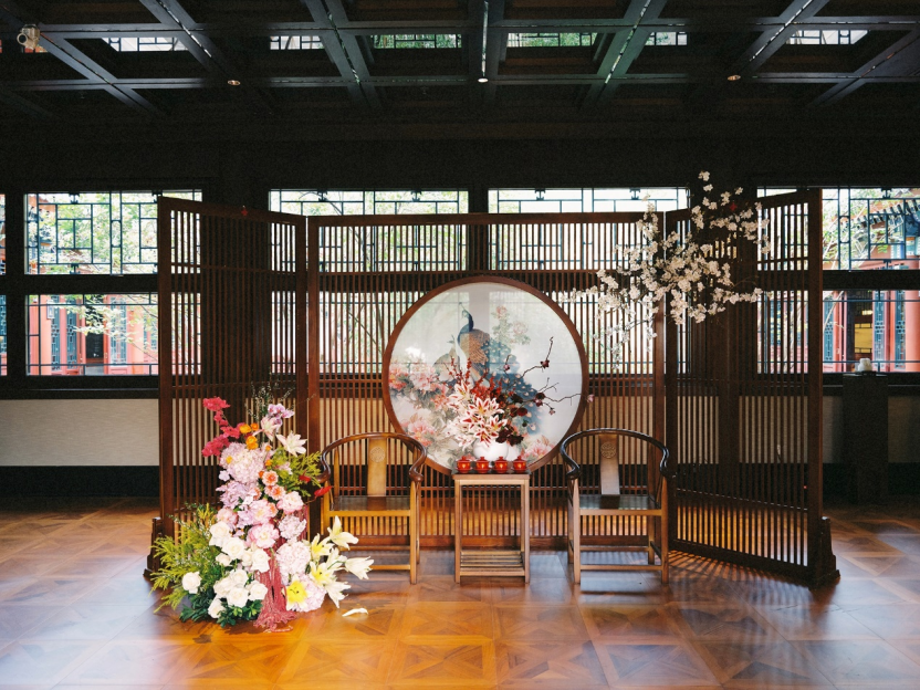在婚礼秀现场,酒店四合院被划分为签到、仪式、敬茶、用餐四大功能区,为新人呈现兼具仪式感与文化底蕴的婚典场景。