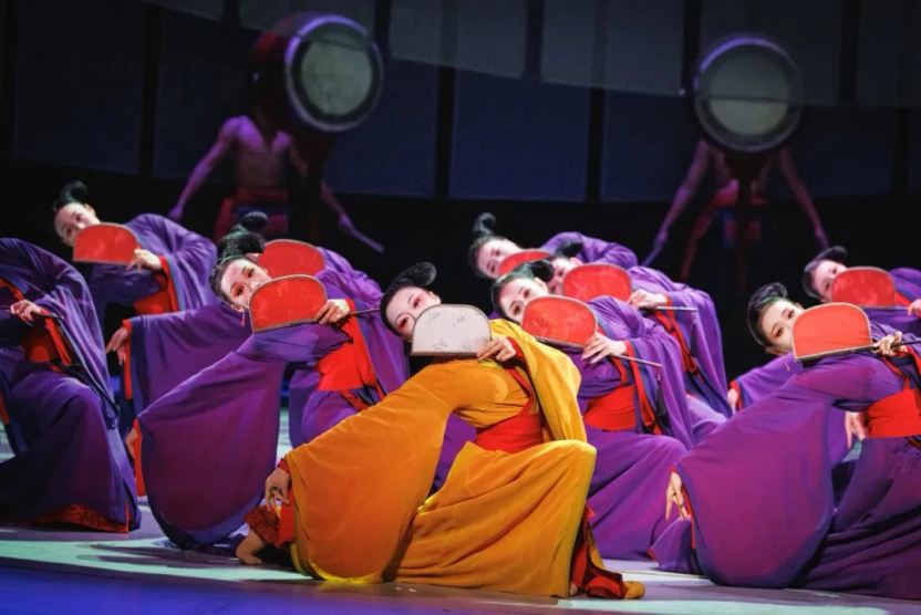 除去叙事手法之外,舞剧《乐和长歌》中加入许多隐喻元素,赋予了每个角色丰富的象征层次和情感的意义。首先在色彩的运用上的就看出导演的用心,在不同的篇章中服饰颜色的使用就映衬出故事的基调,《魅影》中乐伎们深紫色的服饰象征着宫廷的神秘与压抑,主角希音的红色服饰则是像一道火光打破了这种萧肃的氛围,象征着她内心的冲突与挣扎。《故国》中希音的白色服饰则是恍如梦境,代表着她对童年的无忧,自由歌舞的回忆。其次在舞台设计方面,同样有着诸多考量,1:1复制出来的湖北省博物馆馆藏编钟与虎坐凤架双面鼓直接搬到舞台上,让观众直面千年前的历史器物,历史的厚重扑面而来,同时将楚文化通过视觉直接传递给观众。在实体物件如此宏大的基础上,虚拟的竹简设计贯穿全剧始终,让观众仿佛置身在历史的轮回之中。