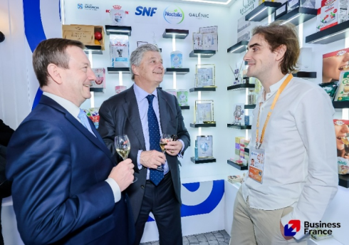 左一法国驻华大使白玉堂先生(Bertrand Lortholary)及左二法国欧洲和外交部部长下属主管外贸和吸引力部长级代表尼古拉·弗里西耶先生(Nicolas Forissier)共同参观品牌展位