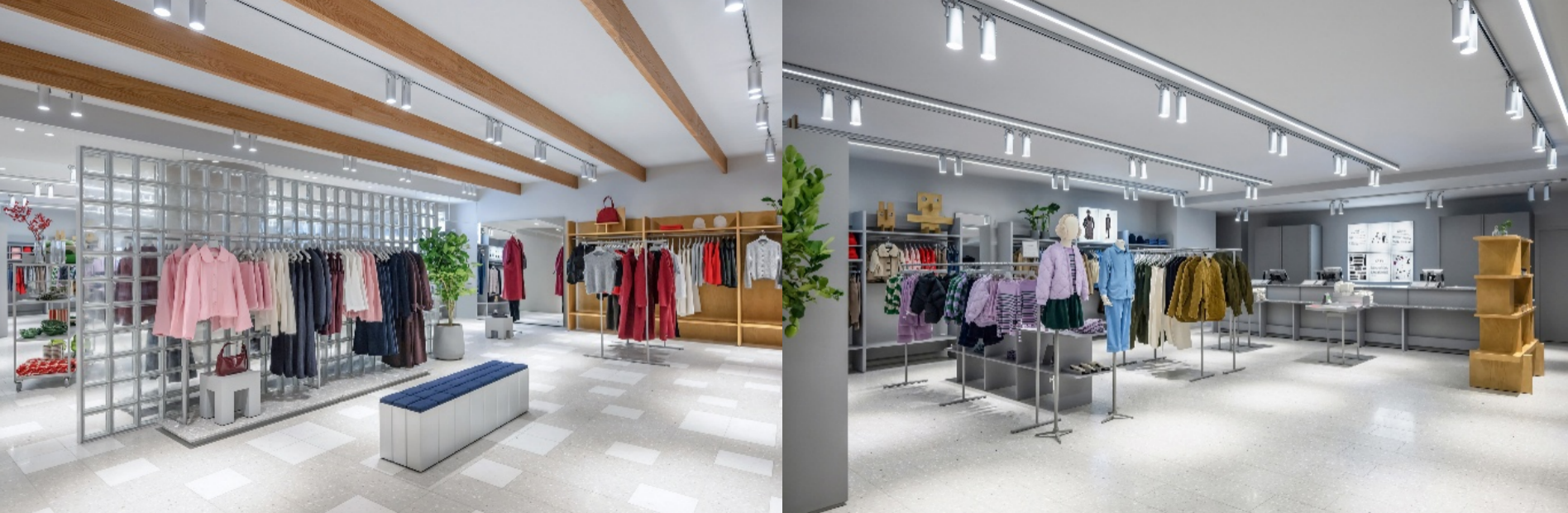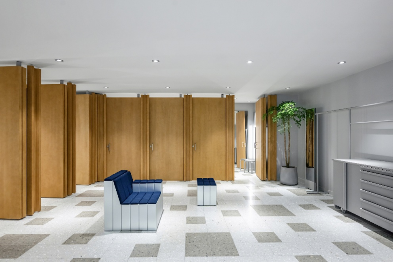 为致敬中国工艺,ARKET在全新旗舰店独家呈现Rectangle系列精选单品。该系列精致独特的家具设计与店铺内部空间及网格状地面纹理相得益彰, 也为试衣间的座椅区域增添一丝优雅气息。