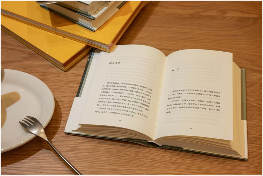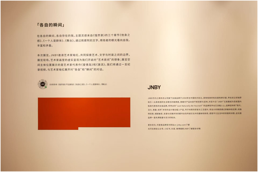 在展区的另一侧,观众可扫描二维码,聆听《惶然录》的“声音明信片”,以声音为媒介,沉浸式进入佩索阿的文字世界。《惶然录》中文版文字由著名作家韩少功翻译,以其凝练而富有灵性的语言,精准捕捉了佩索阿文字中的优美哲思。字里行间透露出的诗性与智性的光芒,穿透了尘世与自然,抚慰了听者心灵的孤独和惶然,展现出极高的文学温度与思想深度。当朗读声在耳畔回荡,与眼前喻红的画作相互交织,JNBY的设计与画面形成呼应:面料的流动性、线条的结构感、剪裁的留白,皆成为文学、艺术与时尚的共生叙事。