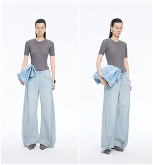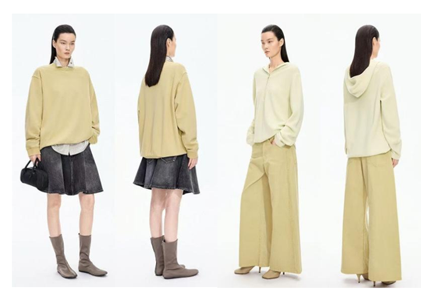在牛仔面料领域,JNBY25秋冬推出“闭环再生牛仔”牛仔单品,面料利用服装生产过程中产生的牛仔边角料进行回收,通过拆解、清洗、开花、纺纱等流程,制成含30%再生棉的杂色靛蓝纱线,再与70%新疆长绒棉混纺成布。全程无需再次染色,最大程度保留原材料的本色与质感。源于自然、归于循环,织造经久耐用的时装,赋予日常以永恒价值。