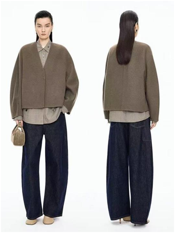 JNBY25冬季新品羊毛呢大衣选用是由Spiber研发的酿造蛋白纤维,使用90%绵羊毛加10% Brewed Protein蛋白质纤维,该纤维通过生物发酵技术制成,具备完全生物降解特性,其质感细腻顺滑,兼具轻盈、柔软与保暖性能。极佳的垂坠感与亲肤性,搭配浅棕色衬衣与深蓝牛仔裤,成为秋冬季高端时尚风景。