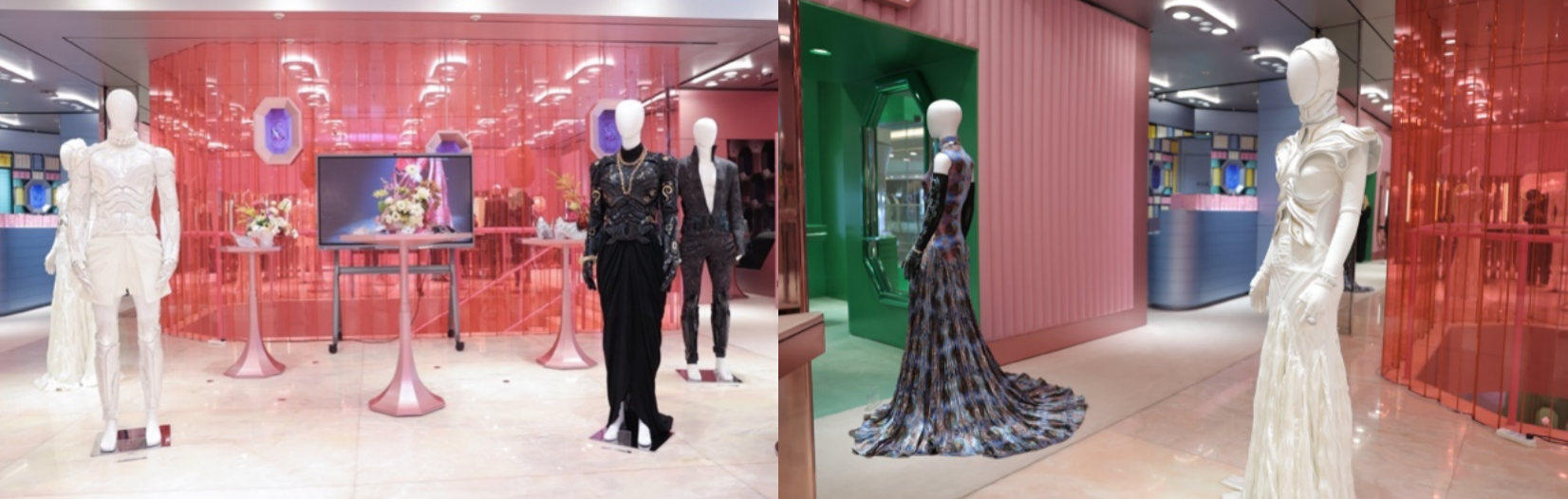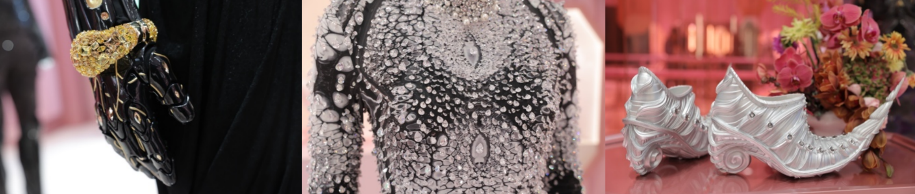 在展陈空间中。施华洛世奇的闪耀元素以璀璨光芒被编织进服装的未来主义线条中,如同将往昔的记忆编码进未来的躯体。当观众移动视角,光线经由仿水晶的精密折射,在3D打印的肌理上流淌、闪烁,仿佛让无机之物拥有了呼吸与心跳,共同探讨着后人类语境下物质与情感的共生关系。