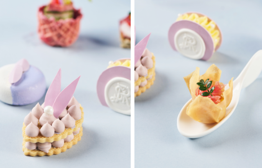 甜品的设计饱含创意巧思,柠檬树莓冷芝士,冷芝士的温润绵密碰撞清冽柠香与树莓鲜活,酸甜平衡恰到好处。玫瑰草莓马卡龙,馥郁玫瑰香缠绕甄选草莓的清甜,彰显法式经典的精致格调。香提奶油黑加仑慕斯,香提奶油为轻盈基底,黑加仑的馥郁酸香融入丝绒慕斯,层次分明且温润雅致。云顶香草雪绒蛋糕,云般绵软的雪绒顶点缀香草芬芳,蓬松肌理搭配丝滑内芯入口即化。 蓝莓千层酥,饱满蓝莓酸甜醇润与酥香交融,每一层都是匠心雕琢的精致。三款咸品分别为:牛肉蔬菜甜菜塔,以鲜嫩牛肉搭配清甜时蔬与绵密甜菜,层次丰富;柠檬章鱼三明治,融合章鱼的弹嫩与柠檬的清新,解腻又爽口;柚子鸡胸沙拉则将嫩滑鸡胸肉与柚子的果香相融,轻食风味恰到好处,为宾客带来精致的味蕾体验。