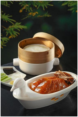 果木烧红袍香辣乳猪:有别于其他烤乳猪,袁师傅的烤乳猪略带香辣口感。在协助南昌香格里拉开业期间,袁师傅发现当地盛产的樟树港辣椒口味独特,入口前期香甜、中期香脆、后期辣而有香,椒香浓烈程度多过其他辣椒。因此结合了其他5种不同辣椒一起,研发一个独特的辣酱来腌制乳猪,打造专属的香辣乳猪。此外他在选材上更为精心,袁师傅选用6斤重的广东幼猪,传承广式乳猪技法,涂抹10多种酱汁腌后用枣木烤制。烤熟的乳猪外表金红油亮、香脆可口,肉质丰腴且软嫩,略带香辣,丰富的口感交织在唇齿中,香味四溢、风味独特。一只红袍乳猪饱满气派端上年夜饭的餐桌,将为整个宴席锦上添花。