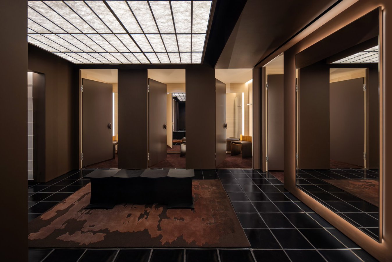 休息区引入众多精妙细节,以当代手法礼赞传统。由深色胡桃木细节点缀的皮草结构感沙发与配套座椅皆由SINGCHAN DESIGN设计,其创作始终致力于探寻古今交汇之境。于此,“砖瓦和谐”这一根植于中国传统建筑中砖石砌筑技艺的概念,成为了贯穿此空间的核心设计灵感,也为其他多款作品带来启发。例如,SINGCHAN DESIGN 的模块化TheWall茶几,就重新诠释了长城的建筑形态。与此同时,非物质文化遗产继承人李文涛也为新店专门定制了精美的灯笼,为整个空间注入温暖和煦的光晕。