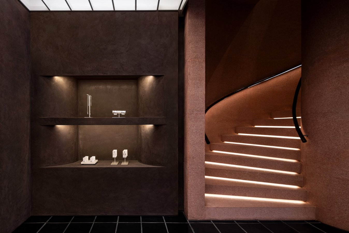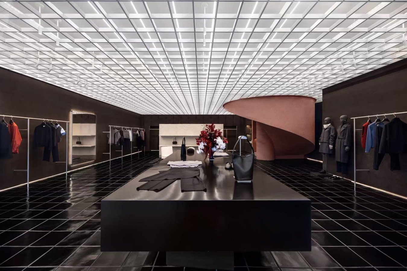 穿过几何格栅的外墙步入门店一层,陈列于铝制陈列架之上的女装与配饰系列便即刻映入眼帘。深色墙面搭配手工陶瓷艺术工作室Zebound定制的瓷砖构成迷人背景,让品牌系列单品轻松成为视线焦点。螺旋楼梯采用深红色的水磨石筑造,灵感源自于紫禁城历经岁月的宫墙,顾客踏着复古的痕迹步入门店二层,新的空间便一览无余。上层区域以更明亮的色调渲染,Zebound手工制作的象牙白瓷砖环绕着女装区域,专注于生产环保再生材质的Smile Plastics,利用再生树脂定制打造了男装系列陈列柜。