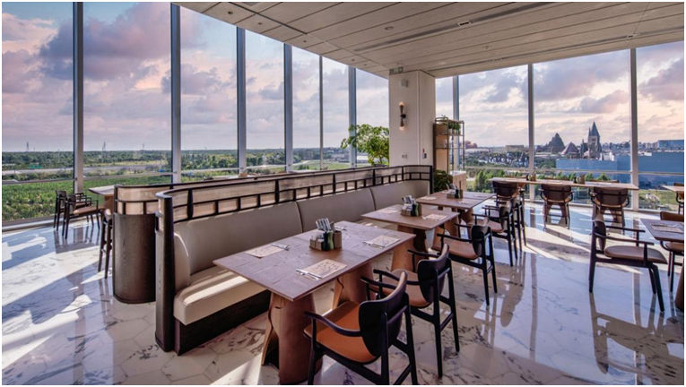 先锋设计 + 艺术赋能,构建垂直生态空间 酒店建筑由国际知名设计公司Aedas 操刀,灵感源自巴比伦空中花园,通过拱形玻璃幕墙与悬挑式“水晶盒”结构,打造“垂直生态空间”,实现建筑与自然共生。室内设计由CCD团队打造,将大运河文化元素通过艺术作品融入空间肌理。核心亮点“艺术盒”与“水晶盒”双社交空间各具特色:1008平米“艺术盒”连通多个艺术多功能厅,“水晶盒”整合接待大堂、全日制餐厅、星空泳池等多重空间;300平米“诺岚花园”适配户外餐饮、婚礼等场景,310平米屋顶花园可观赏环球夜景,全面满足多元社交需求。