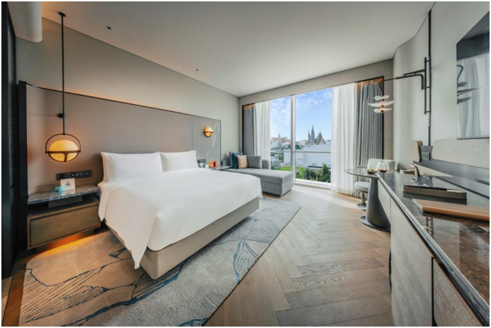 多元客房 + 精致餐饮,解锁全场景奢享体验 酒店匠心打造329间时尚奢华客房及套房,均配备法国天然高端洗护用品、定制香薰与多场景音乐系统。以运河镇水神兽“蚣蝮”为环保吉祥物,将绿色理念融入服务,并特设宠物友好客房、亲子主题客房及环球影城城堡观景房,让入住体验更具惊喜感。