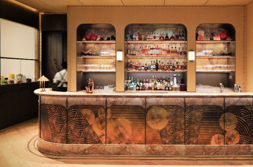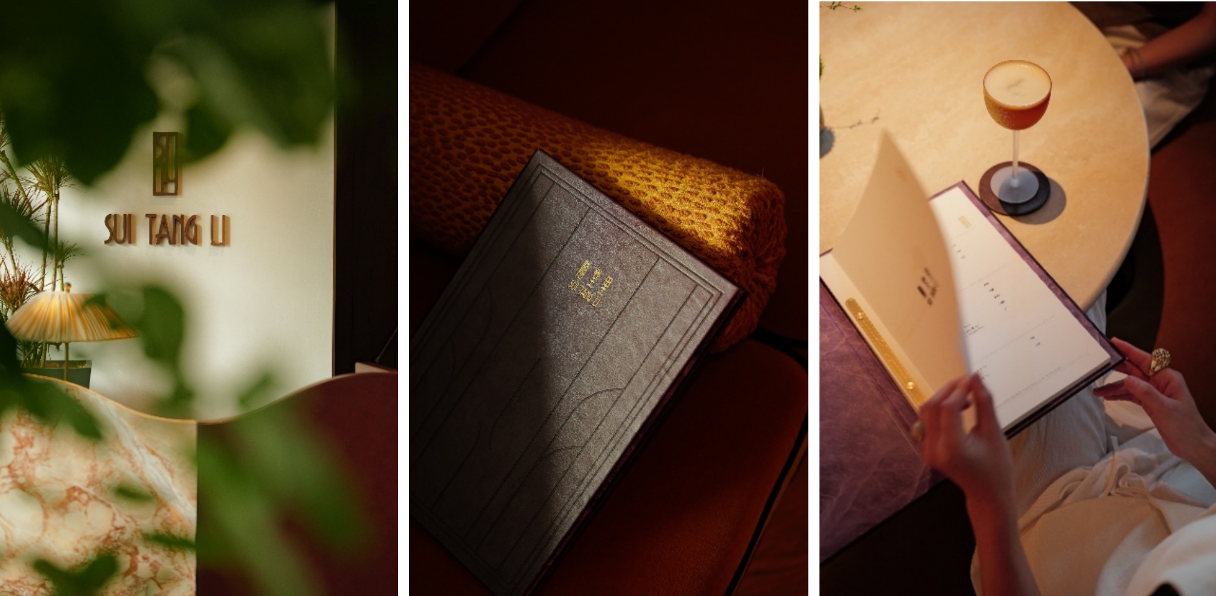 三重空间叙事:从上海里弄到现代雅宴的沉浸体验 随堂里以三重空间层次重新定义现代用餐体验。全新打造的一层私宴包厢由澳洲知名设计工作室Mitchell & Eades操刀,以摩登雅致的笔触,重现上海里弄的温情与趣味。设计从当代上海文化中汲取灵感,将旗袍盘扣等精致元素巧妙融入Art Deco的几何线条之中,于细节处彰显匠心。空间以暖褐色为主调,搭配水波纹玻璃隔断、定制几何纹样地毯与柔和的间接照明,营造出既私密又通透的视觉效果。四间主题包厢分别以“暖褐”、 “沁白”、“釉青” 与“胭紫”与命名,各具特色——“暖褐”延续酒吧区的视觉语言,长桌的布局呈现自在随性的氛围,“沁白”与“釉青”间的可开合屏风则实现空间的灵活转换,满足从私密家宴到半开放酒会的多元需求,而"胭紫"包厢的悬浮式穹顶赋予空间戏剧张力。