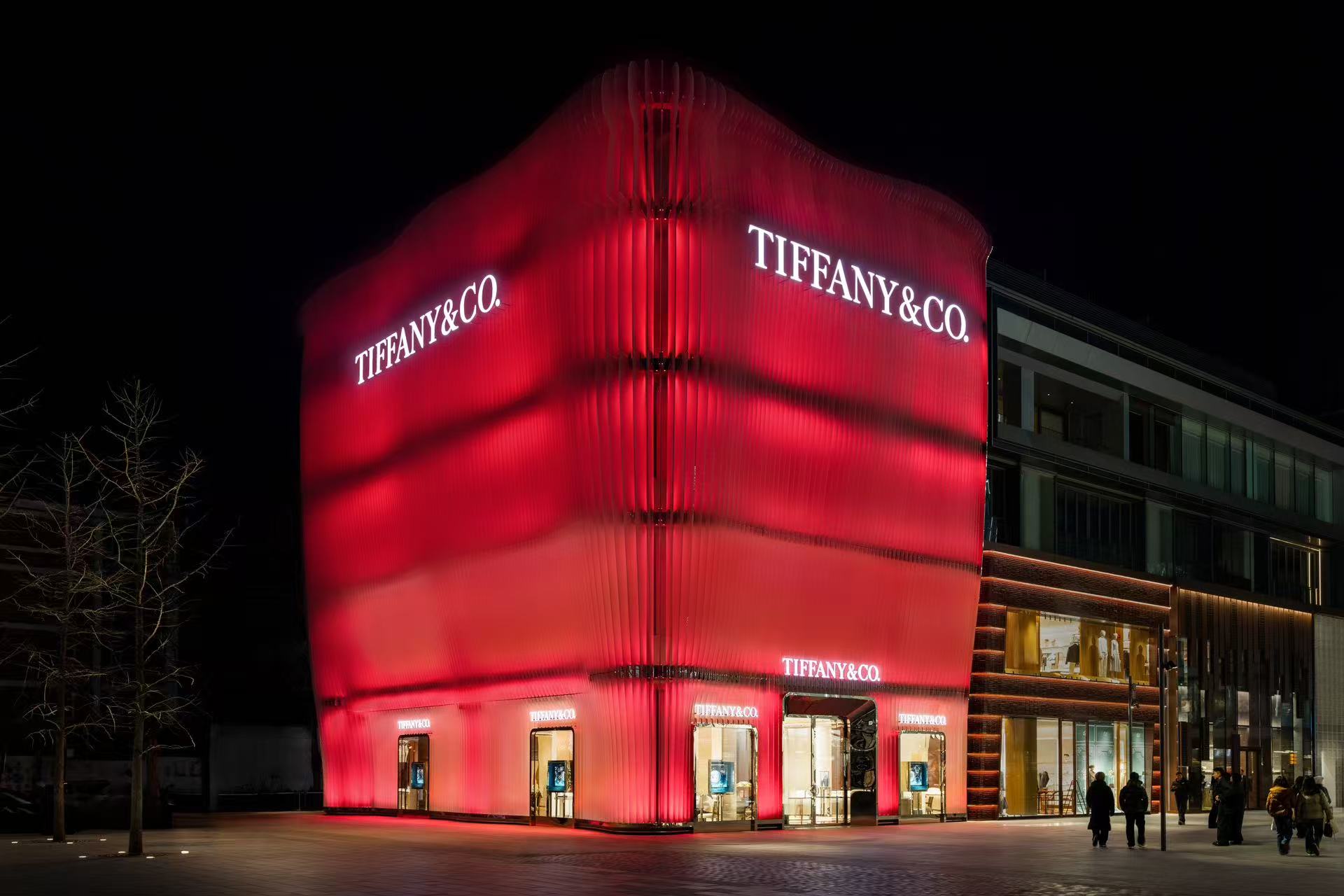 旗舰店外立面由MVRDV建筑事务所设计,灵感源自品牌传奇设计师艾尔莎·柏瑞蒂(Elsa Peretti)经典作品的优雅之美。外立面采用经环保回收并于本地制造的鳍片式玻璃构筑,不仅彰显品牌对可持续理念的坚持,更于光影互动中展现出独特的律动之美。如今,以精妙灯光设计的“中国红”,令外立面于岁末的寒夜中绽放温暖动人的光芒,在延续建筑本身诗意表达的同时,礼赞即将到来的农历马年。