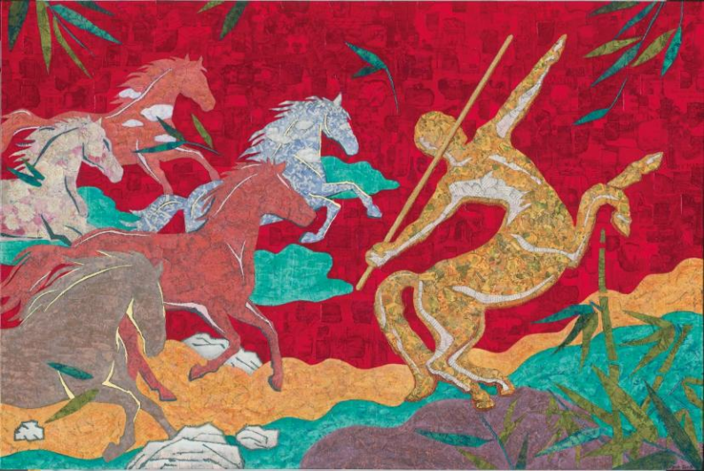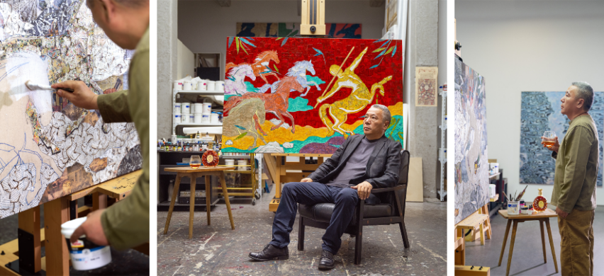 邑马当先,连接酒庄历史与东方意象的艺术长卷 全新艺术臻品“邑马当先”整体画作凝练着中国文化的底蕴,寓意着一马当先、引领前行,传递出顺遂与繁盛的美好寓意。薛松运用其擅长的波普拼贴艺术手法,结合中式水墨画的风格,以探讨中西方艺术融合的角度切入创作,艺术家在长1.8米、宽1.2米的宽阔图景中,展现着半人马驭领新程之姿。