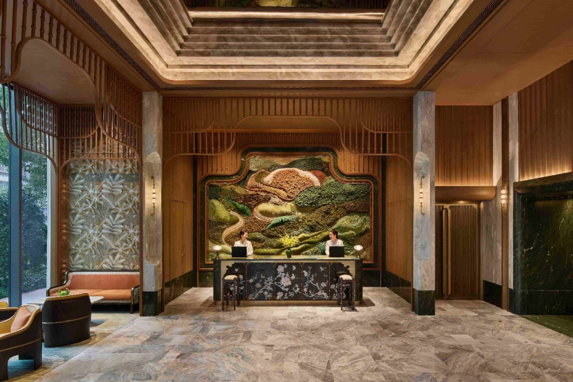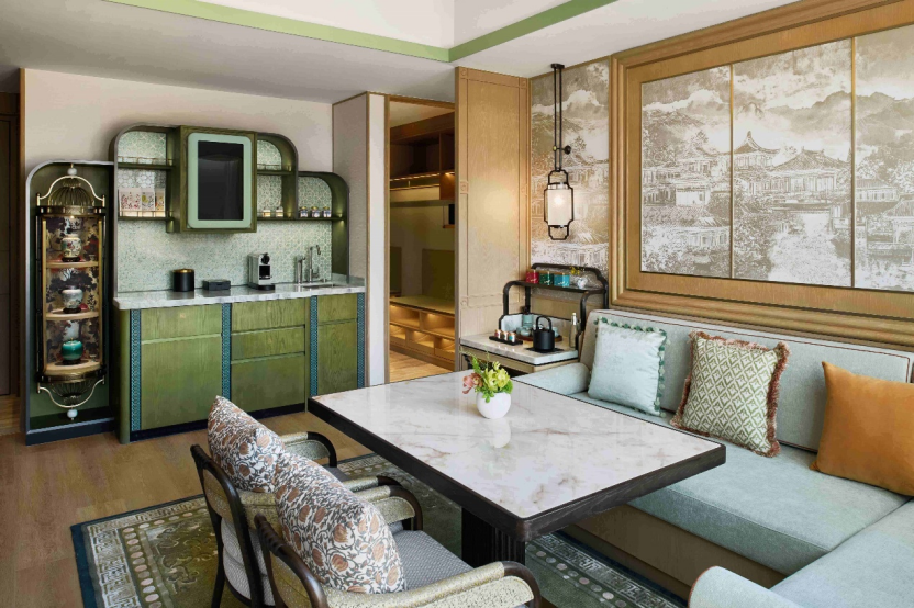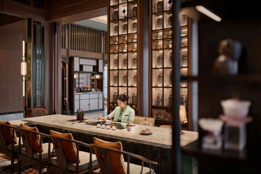 昆明香格里拉以层次丰富的美学,再现云南茶商于私宅款待贵宾的雅致意境,宛若城市中心隐谧的“茶商府邸”。整体空间融合当地茶园的清雅静谧与春城庭院的盎然生机,呈现独特地域风情与文化韵味。从“秘密花园”陈列的文化瑰宝,到前厅的艺术装置《织山》和《织春》,无不将春城的诗意景致和人文底蕴尽数彰显。位于18楼的豪华阁贵宾廊,则将云南民居的质朴美学与现代奢华格调相融合,正中央的红铜壁炉以当地传统火塘为原型打造而成,营造围炉品茗的温馨氛围和昆明独有的烟火气息;回廊上的花窗呈现“一步一景、隔而不断”的东方意境,光影错落间让宾客在每一步都能感受到彩云之南的独特魅力。