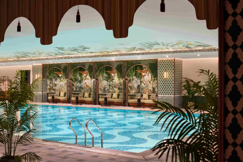 酒店室内恒温泳池以热带雨林为设计灵感,绿意盎然间光影流转,是理想的拍照打卡地。泳池一侧的躺椅休憩区,以金色格栅拱门搭配垂坠藤蔓与繁茂绿植壁画,勾勒出“都市绿洲”的静谧质感。另一侧的鸟笼式休憩亭通透雅致,宛如私享雅座,毗邻儿童池与桑拿池,可供三五好友或阖家同享惬意时光。此外,24小时开放的健身空间配备齐全的专业力量及有氧器械和独立瑜伽室。