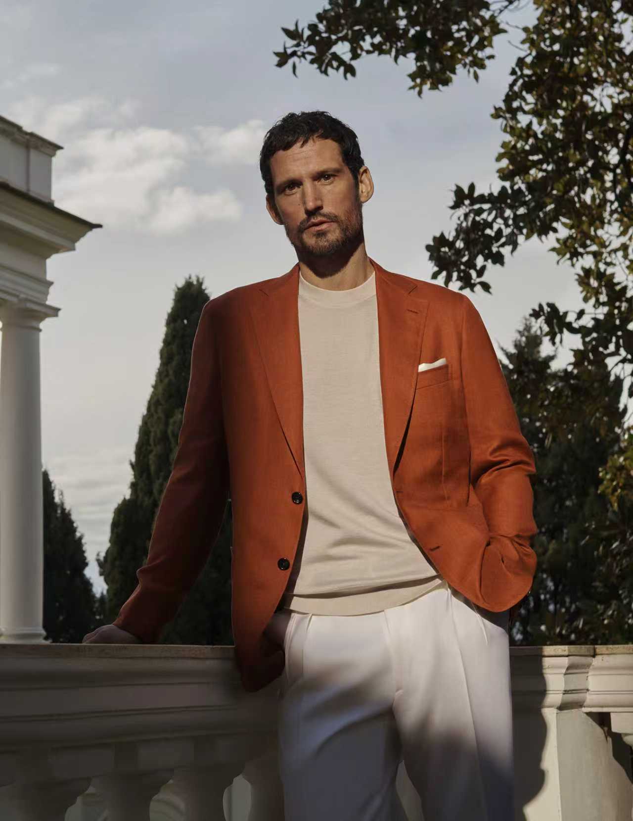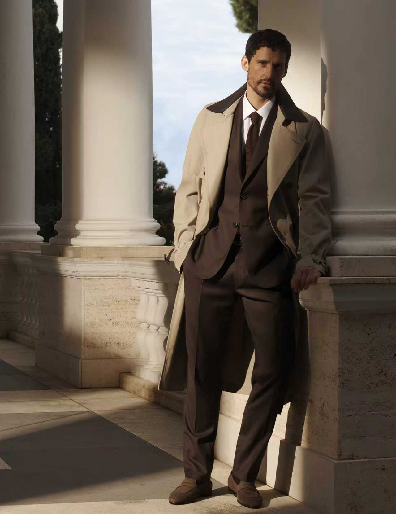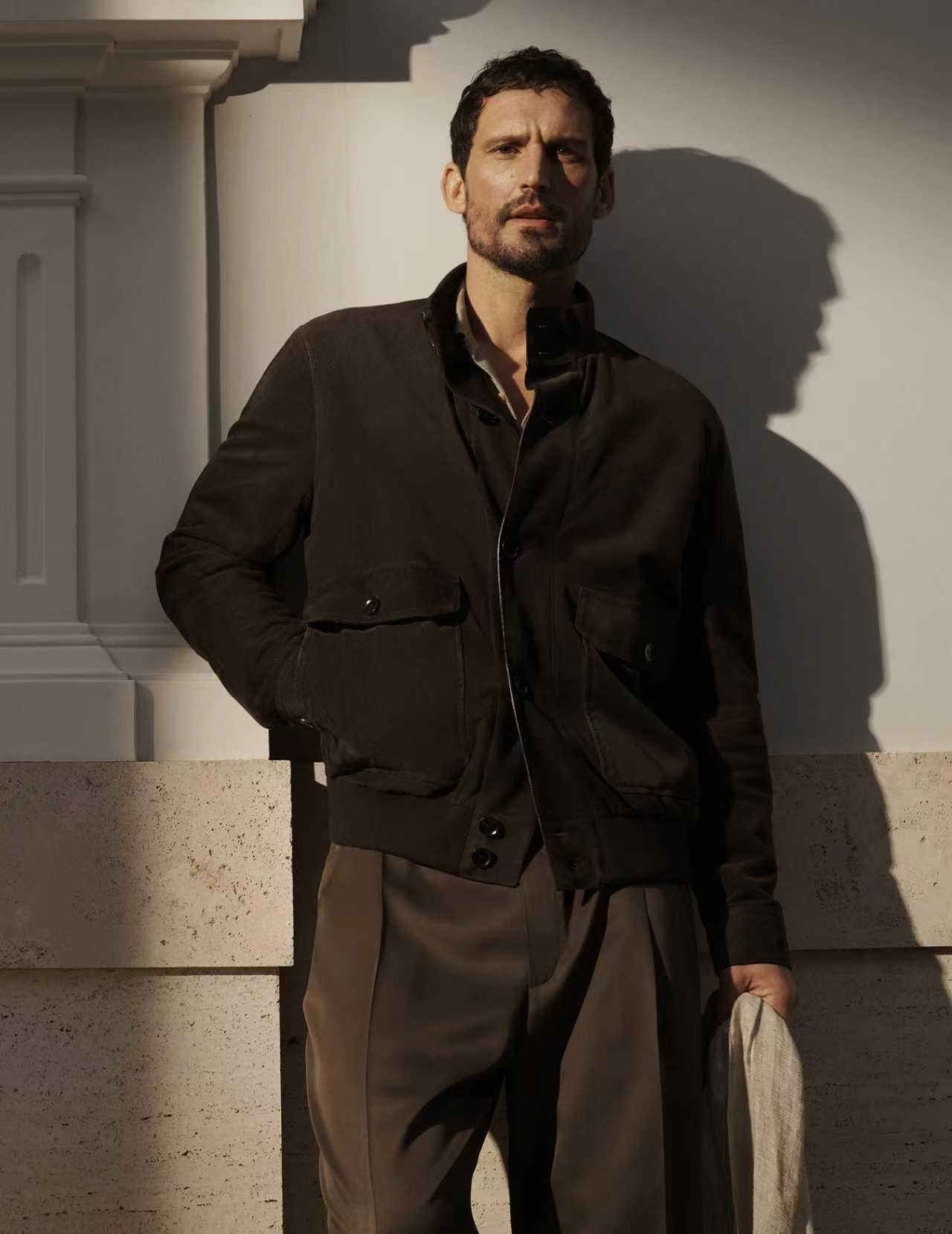 系列重点单品包括触感细腻的磨砂皮外套,体现 Brioni 布里奥尼将皮革工艺专长与感官质感融为一体的品牌特质。Solaro 等经典轻量面料、标志性的 Soffio 软构西装外套,以及考究的裁缝式外套,在光线流转中彼此呼应,进一步强化材质纹理与色彩层次的深度表现。