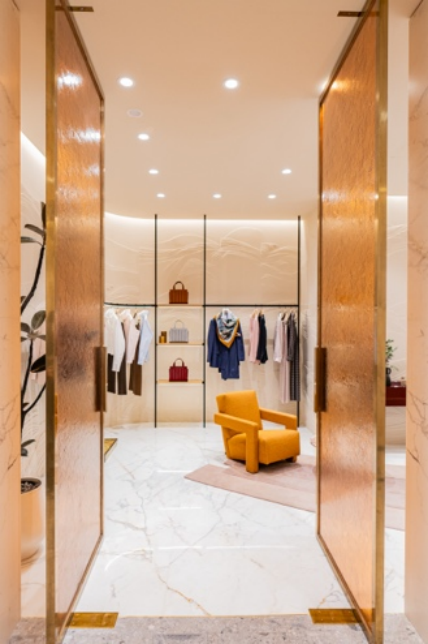 步入店内,精心调配的色彩与材质,铺展开一方雅致天地。灰色 Ceppo di Gré 石材以沉稳严谨的建筑肌理奠定空间基调,搭配暖白色纹理灰泥墙面,柔化整体氛围,更将光影的层次与质感演绎得淋漓尽致。在这明亮的中性基调中,一面由卡拉卡塔金大理石打造的配饰展示墙成为视觉焦点:大理石的天然纹路间,晕染着品牌标志性的驼色与皮革色调,既呼应了Max Mara的经典品牌基因,又为整体空间构图添上一抹温润暖意。