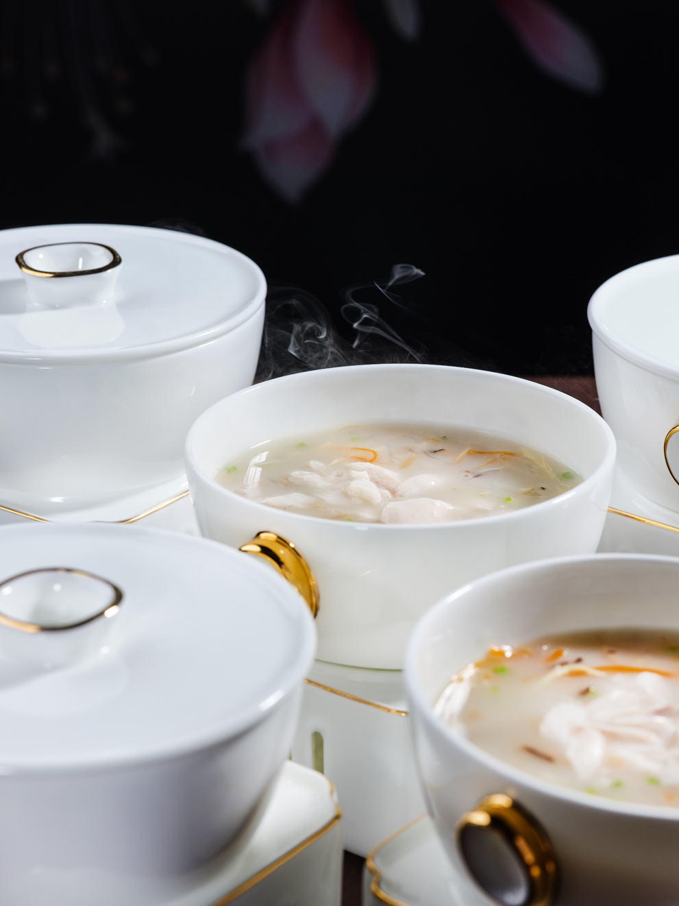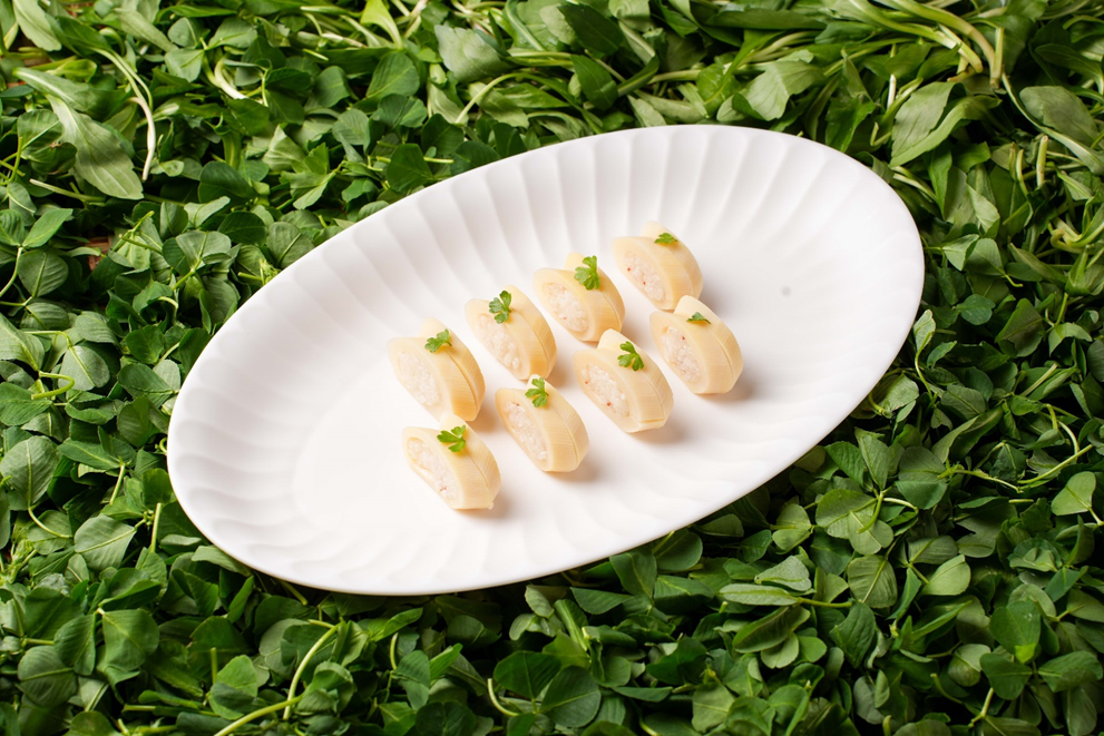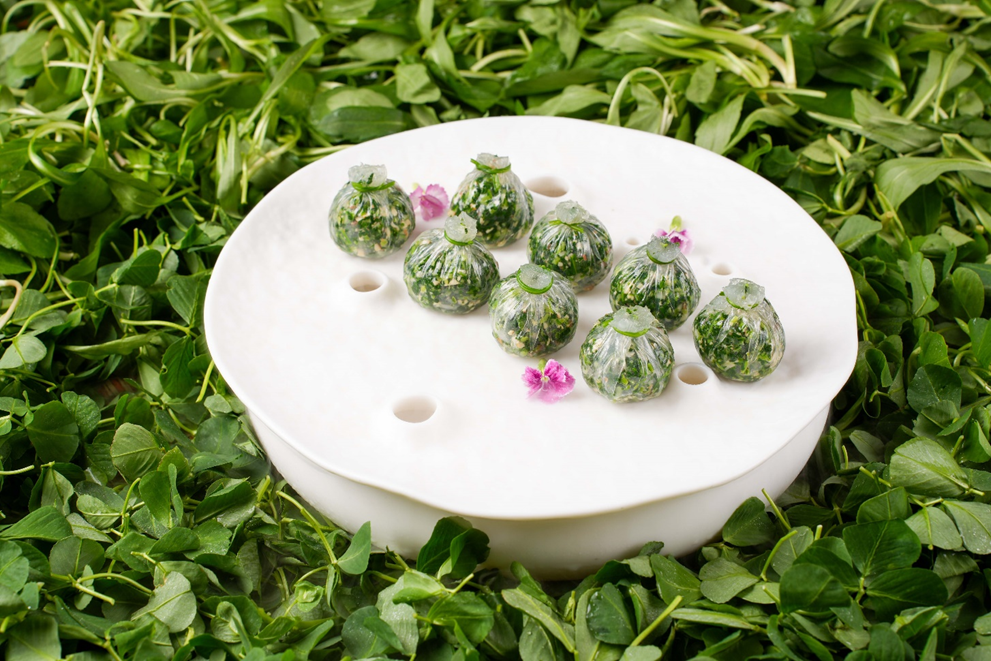 撷春日野菜马兰头的清鲜嫩爽,搭配阜阳香干细切拌匀,清香爽口、咸鲜入味。以轻薄透亮的越南春卷皮包裹成型,捏成小巧玲珑的石榴包造型,造型雅致灵动,入口清鲜柔和,满口皆是春日野趣,清淡间滋味丰盈,是江南春日最具代表性的清鲜小品。江南米鱼羹