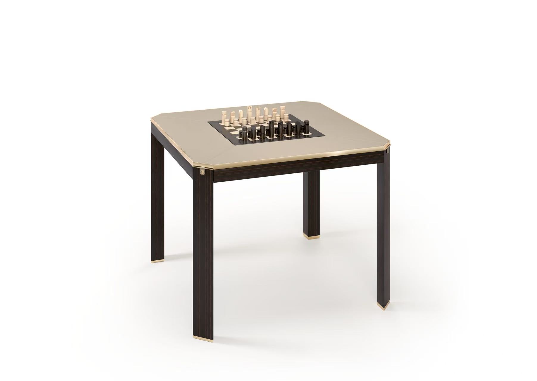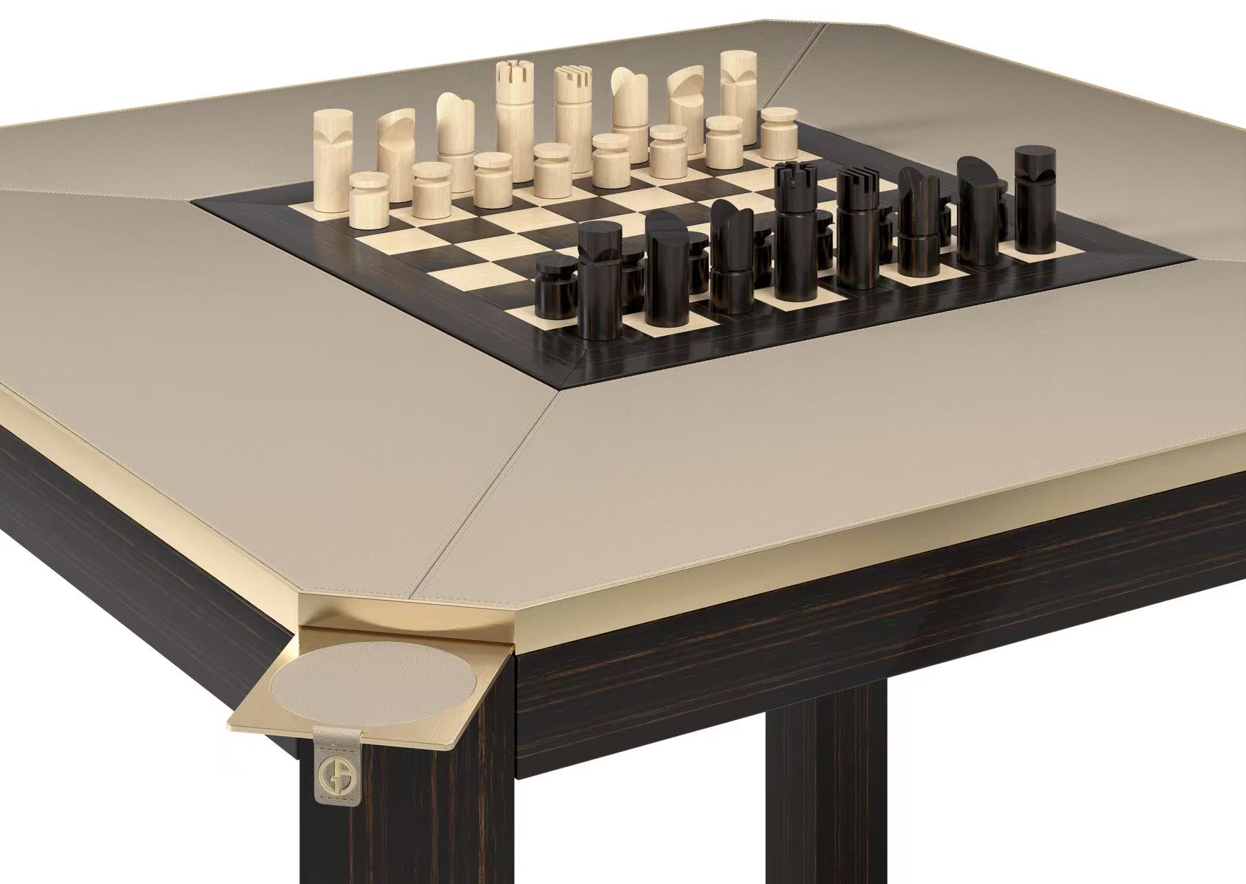 这款以装饰艺术为灵感打造的游戏桌,结构主体精选乌木,桌面覆以灰褐色皮革,并缀以哑光浅金色黄铜镶边与细节装饰,尽显低调奢华的质感。旋转式中央桌面开启后,映入眼帘的是由乌木与天然枫木拼接而成的棋盘格纹表面,专为对弈国际象棋或西洋跳棋而设。桌体配有两个抽屉,内置精美游戏棋子;四角巧妙隐藏可抽拉式杯托,细节之处尽显巧思。