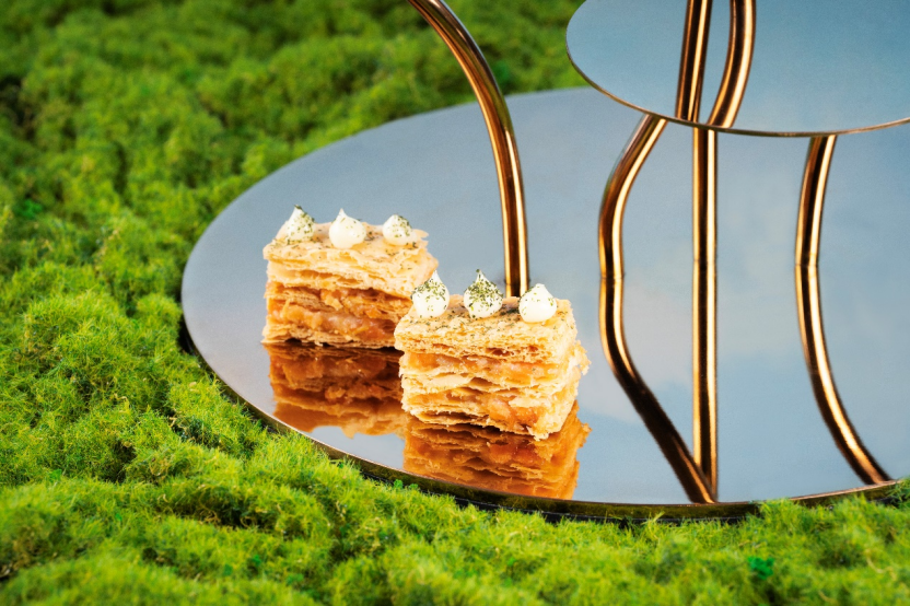 烟熏三文鱼拿破仑,千层酥皮层层酥脆、入口化渣,包裹烟熏三文鱼与清爽柔润奶油,咸香馥郁、 轻盈不腻。以法式经典工艺演绎轻盈焕亮的灵动感,如同肌肤卸下负担、焕现通透光采,轻盈优雅,自在绽放。