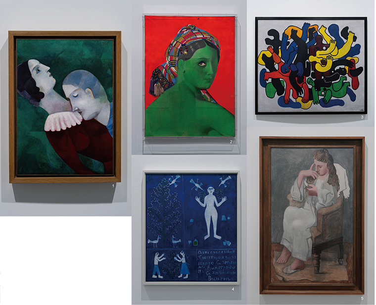 1.3.4.北京民生现代美术馆展览现场;2.马歇尔·雷斯,《大宫女》,1964年,丙烯颜料、物件、照片裱于布上,130x97cm;5.巴勃罗·毕加索,《阅读的女人》,1920年,布面油彩,166x102cm