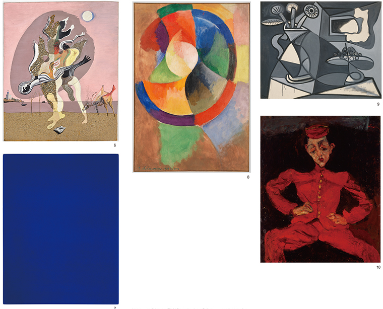 6.萨尔瓦多·达利,《腐烂的驴》,1928年,木板上油彩、沙、砾石拼贴,61x50cm;7.伊夫·克莱因,《IKB 3,蓝色单色画》,1960年,布面纯色颜料和合成树脂,裱于木板,199x153cm;8.罗伯特·德劳内,《圆形,太阳2号》,1912年-1913年,布面胶彩,100x68.5cm;9.巴勃罗·毕加索,《花瓶与果盘》,1943年9月14日,布面油画,80.5x100cm;10.柴姆·苏丁,《青年侍者》,1925年,布面油彩,98x80.5cm