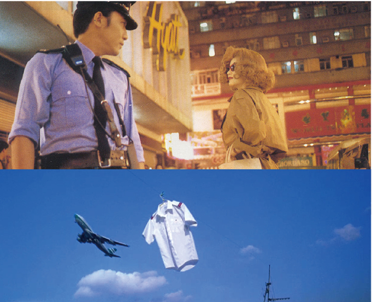 编号为223的警察失恋后患上失恋综合征,与金发女杀手擦肩而过后又离奇相遇并有了一晚温情。可是,他们的爱情还是结束了。快餐店新来的女招待阿菲爱上了时常光顾快餐店的编号为663的警察,因拆了他的女友留在快餐店给他的“分手”信,阿菲知晓了他的心情,偷拿到他的钥匙趁他不在时常潜入他家,一边梦游一边悄悄地改变他的生活,终在被他撞见时令其感受到情感的回归。然而,这才是他们爱情的开始。在《重庆森林》中,两个故事都以黄暖色调和蓝冷色调区分不同的人物,他们的互动让影片色彩呈现冷暖交织的视觉效果。如女通缉犯总是穿着鲜艳的黄色风衣,戴着黑色墨镜(据说这是因为她喜欢做好万全准备,但这并没令她躲过印度人的集体跑票),在她与失恋警察相遇的酒吧里,也都是大片的橙黄色。而她的对手——重庆大厦里的印度人,却大都穿着白色汗衫,或饱和度极低的蓝色上衣,出现在白炽灯耀眼,墙上贴着灰色报纸的宿舍里。