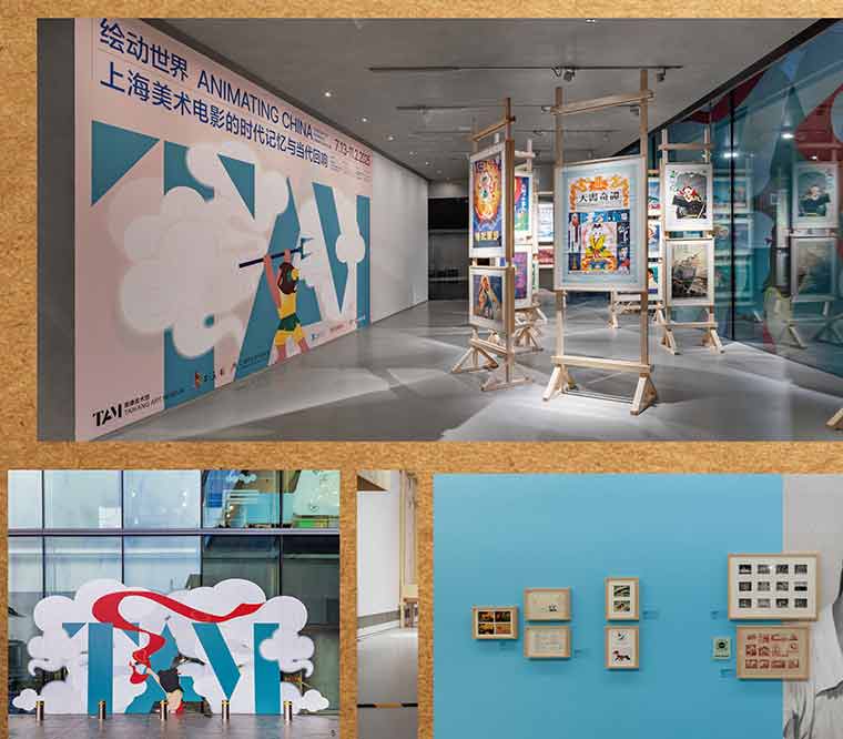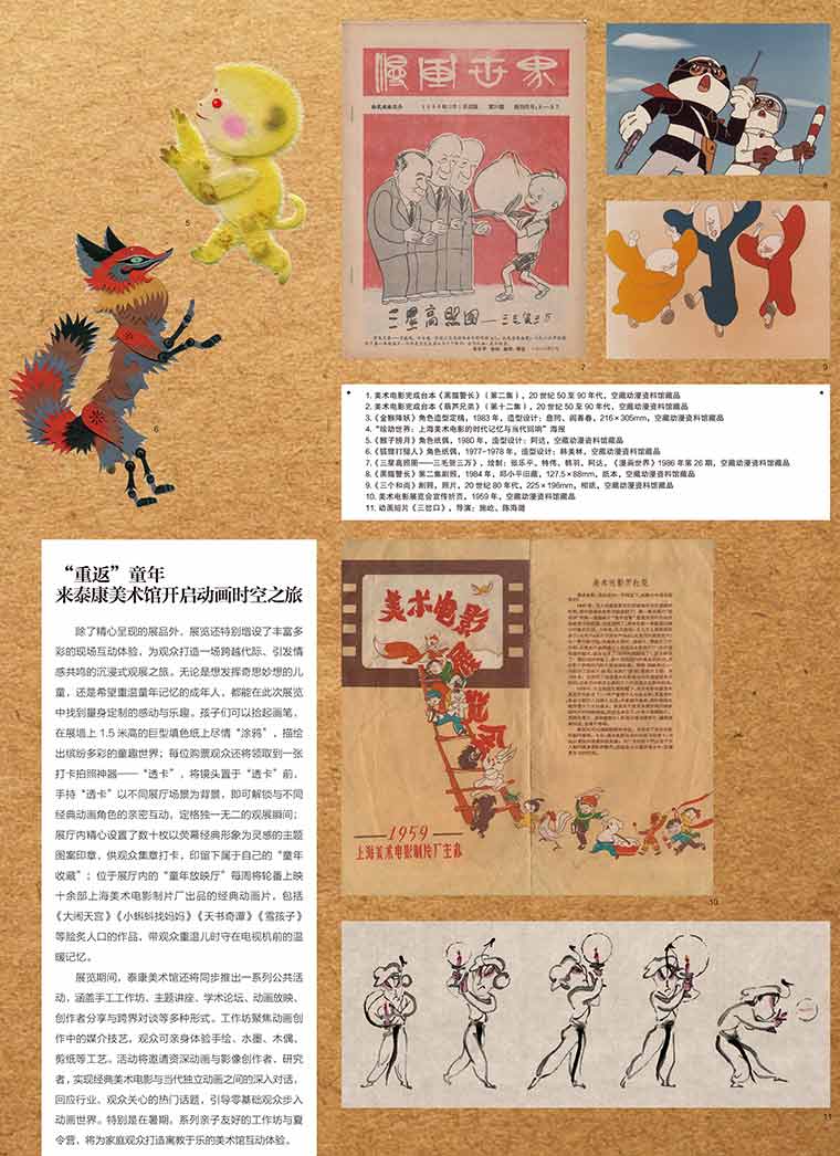 绘动世界上海美术电影的时代记忆与当代回响 于泰康美术馆亮相的“绘动世界:上海美术电影的时代记忆与当代回响”是关于上海美术电影制片厂的大规模、综合性文献和艺术巡展。本次展览系统梳理了上海美术电影的发展史,综合呈现上海美术电影独特的创作体系,展示了其对于社会生活、当代文化的影响与塑造。展览依据从“台前”到“幕后”的展示逻辑,设置了“序厅”“经典巡礼”“媒介探索”“当代回响”“绘动之旅”五个单元,集中展出逾1000件珍贵展品与百余个经典动画角色原稿,涵盖签绘台本、分镜台本、美术设计稿、模型、工具、工作照、赛璐珞片与口述影像。 步入展厅,观众首先将穿越一片色彩斑斓的经典动画海报林,构成本次展览别具特色的视觉前奏。进入“序厅”,迎面而来的宽幅视频中闪烁着不同时期的片头“上海美术电影制片厂”集锦,背后则投映着经典动画角色的动态剪影。两侧墙上整齐陈列着约200本上海美术电影制片厂动画的完成台本,是向美术电影及电影人的无声致敬。“经典巡礼”部分综合考虑了作品知名度、艺术价值及展品数量,以《大闹天宫》《哪吒闹海》《三个和尚》《金猴降妖》《天书奇谭》《葫芦兄弟》《黑猫警长》《邋遢大王奇遇记》《宝莲灯》等多部重要作品为案例,结合文献、实物和访谈,呈现了这些动画片的制作过程和场景,诠释了美影人的探索和开拓精神。在“媒介探索”单元,展览根据不同媒介的创作方式,分别介绍了手绘动画、剪纸动画、水墨动画、偶动画四大片种的特征。同时,通过复原美术片不同片种的工作场景,引领观众深入了解不同媒介美术电影的制作技法,感受上海美术电影创作者的匠心温度。“当代回响”部分精选了动画院校师生和当代独立动画创作者们不同风格的动画,讲述了他们的创作过程,用当代的动画创作创新和实践来回应中国美术电影的历史,也充分展现了动画人之间的历史传承。在展厅结尾处,“绘动之旅”单元以时间轴的方式,串联起文献、实物、影像、大事记等图文资料,全景式呈现上海美术电影的百年发展史。