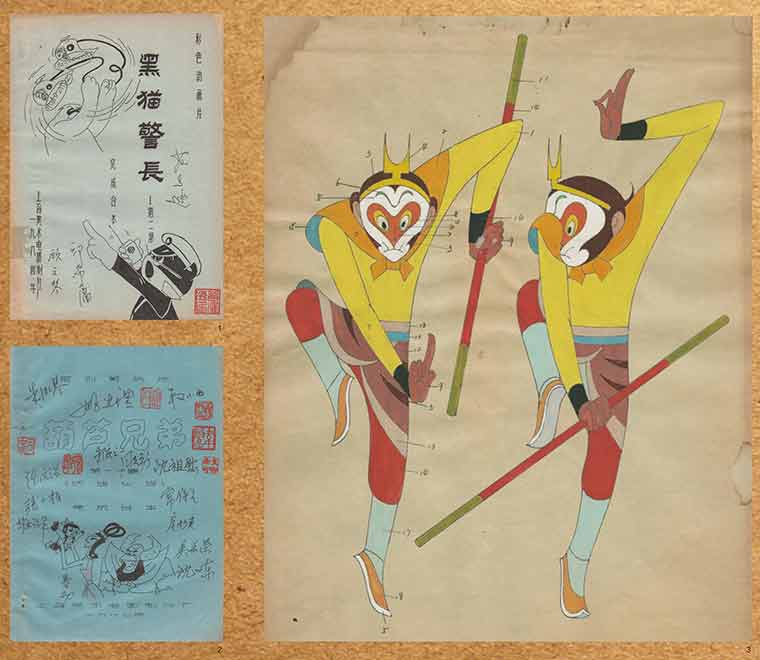2.美术电影完成台本《葫芦兄弟》(第十二集),20世纪50至90年代,空藏动漫资料馆藏品3.《金猴降妖》角色造型定稿,1983年,造型设计:詹同、阎善春,216×305mm,空藏动漫资料馆藏品4.“绘动世界:上海美术电影的时代记忆与当代回响”海报5.《猴子捞月》角色纸偶,1980年,造型设计:阿达,空藏动漫资料馆藏品6.《狐狸打猎人》角色纸偶,1977-1978年,造型设计:韩美林,空藏动漫资料馆藏品7.《三星高照图——三毛贺三万》,绘制:张乐平、特伟、韩羽、阿达,《漫画世界》1986年第26期,空藏动漫资料馆藏品8.《黑猫警长》第二集剧照,1984年,邱小平旧藏,127.5×88mm,纸本,空藏动漫资料馆藏品9.《三个和尚》剧照,照片,20世纪80年代,225×196mm,相纸,空藏动漫资料馆藏品10.美术电影展览会宣传折页,1959年,空藏动漫资料馆藏品11.动画短片《三岔口》,导演:施屹、陈海璐“重返”童年来泰康美术馆开启动画时空之旅